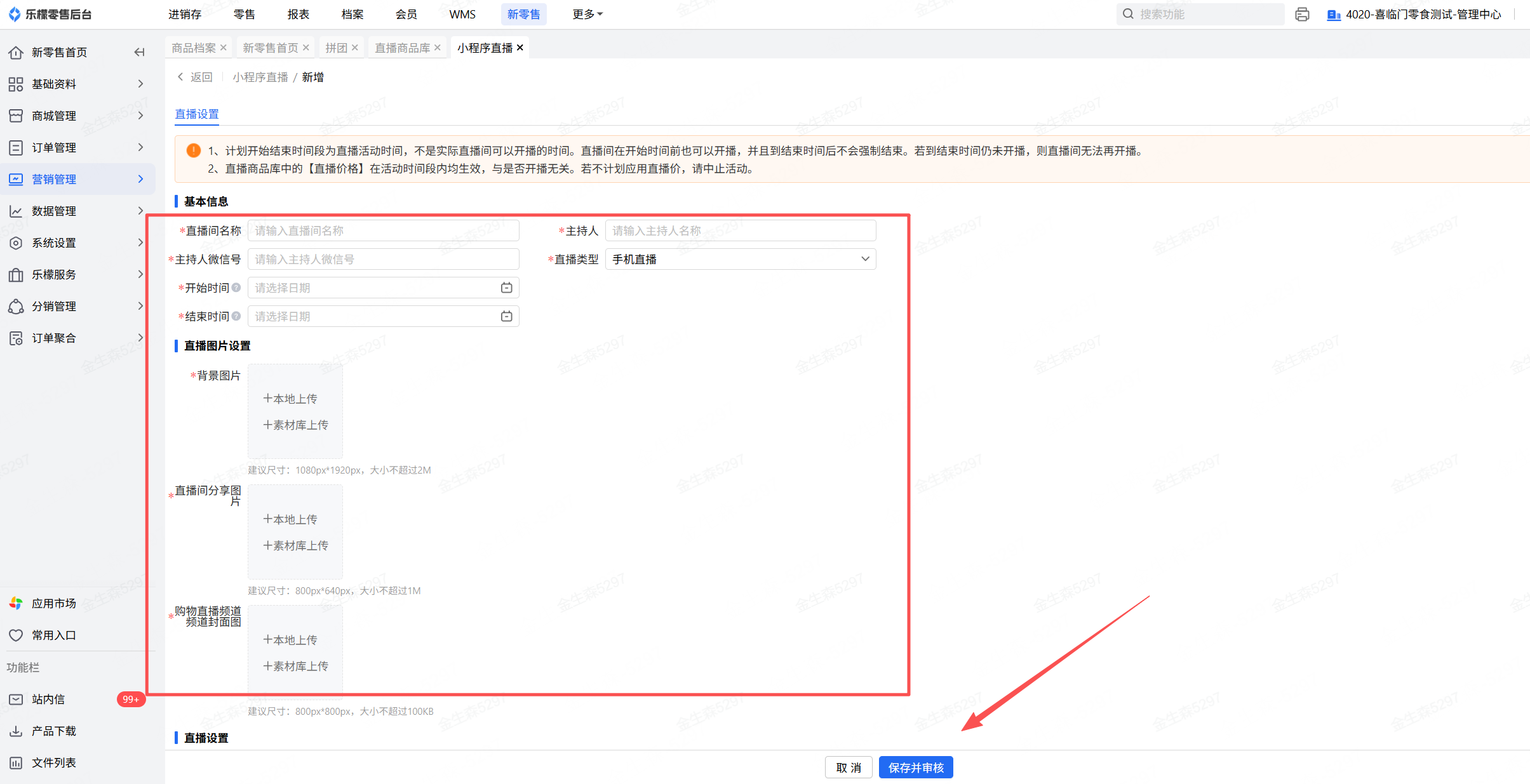 进入营销-小程序直播,点击新增填写主播相关信息、直播参数设置,最后点击保存并审核