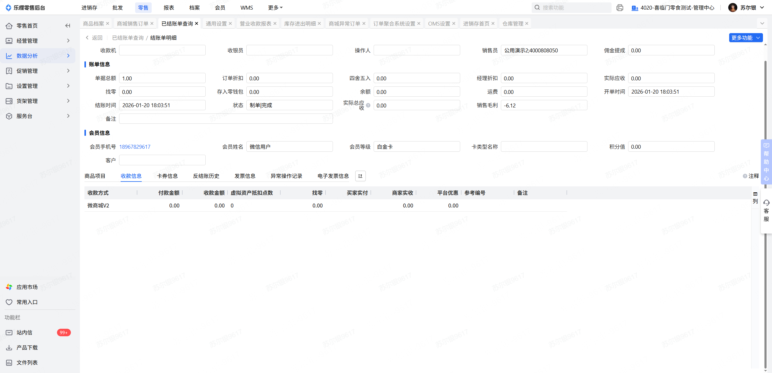 当商城添加组合商品进行售卖时,前台核销后正常生成组合商品的已结账单,且进出库明细中正常扣减组合明细商品的库存