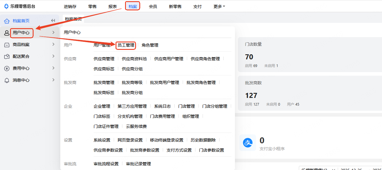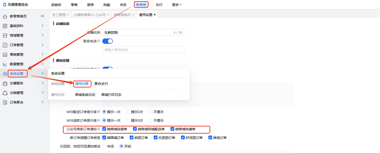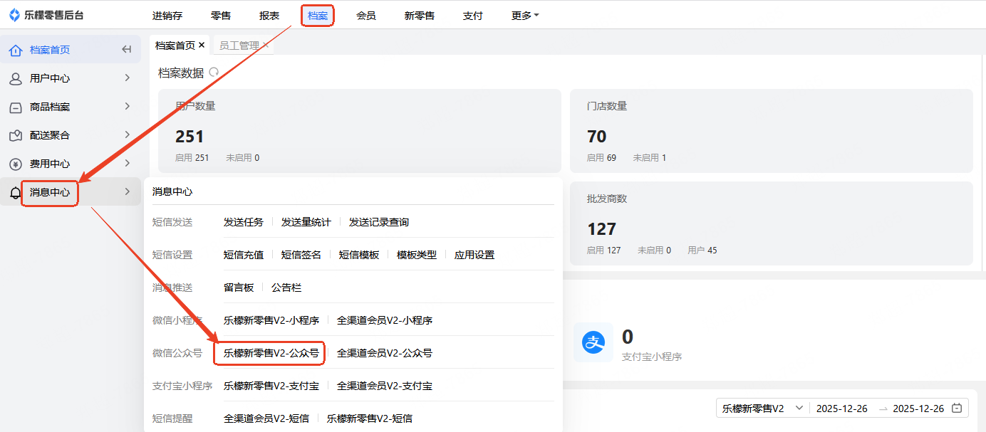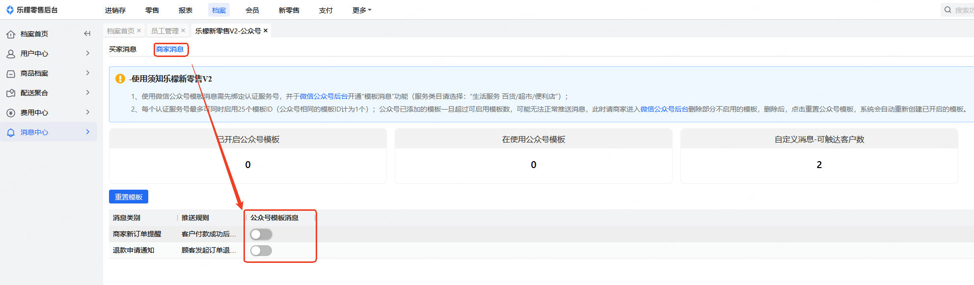 👉【操作路径】:档案-消息中心 - 乐檬新零售V2-公众号