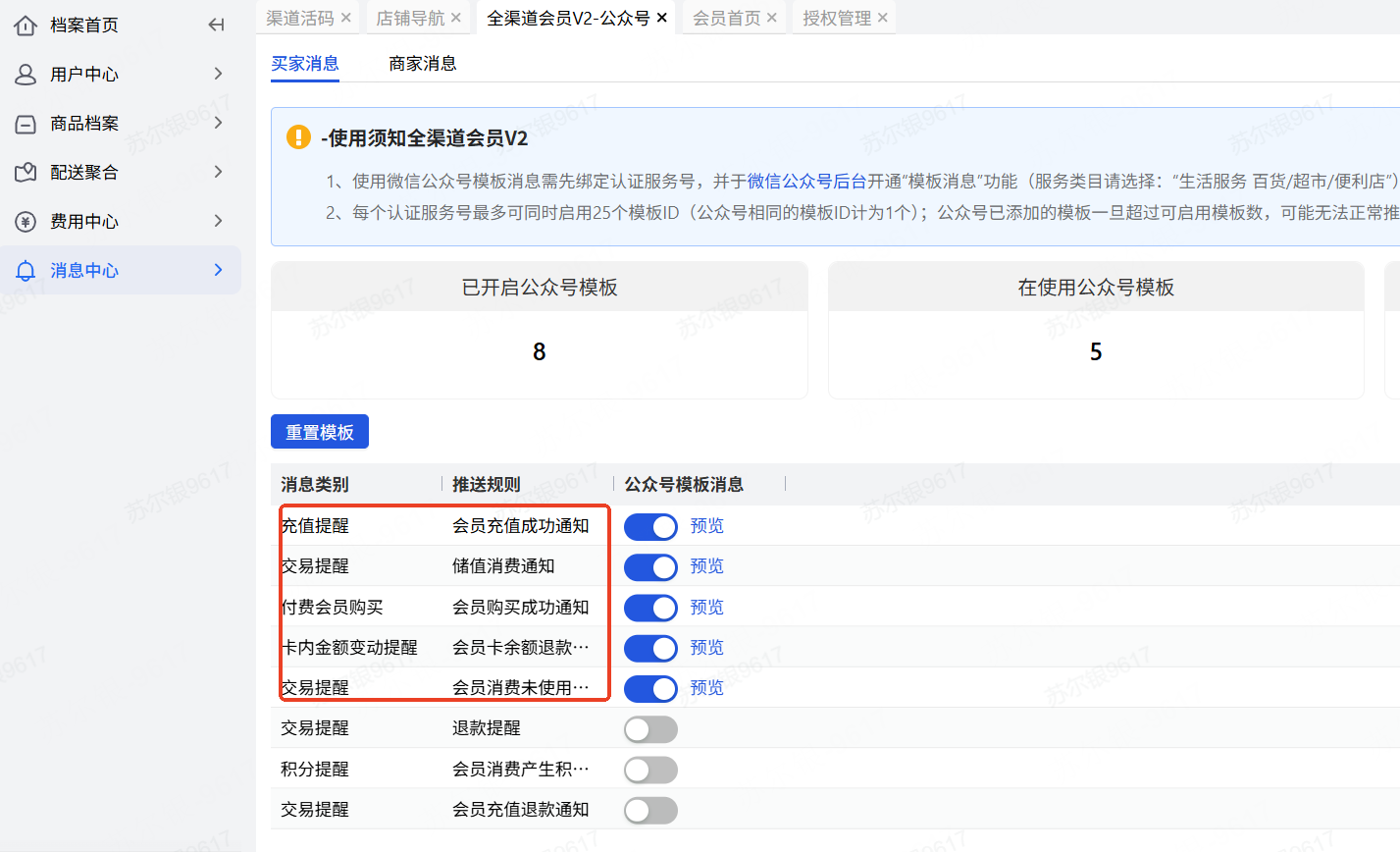 5、在消息中心-微信公众号-全渠道会员v2-消息推送中 开启所需推送消息(见图4)
