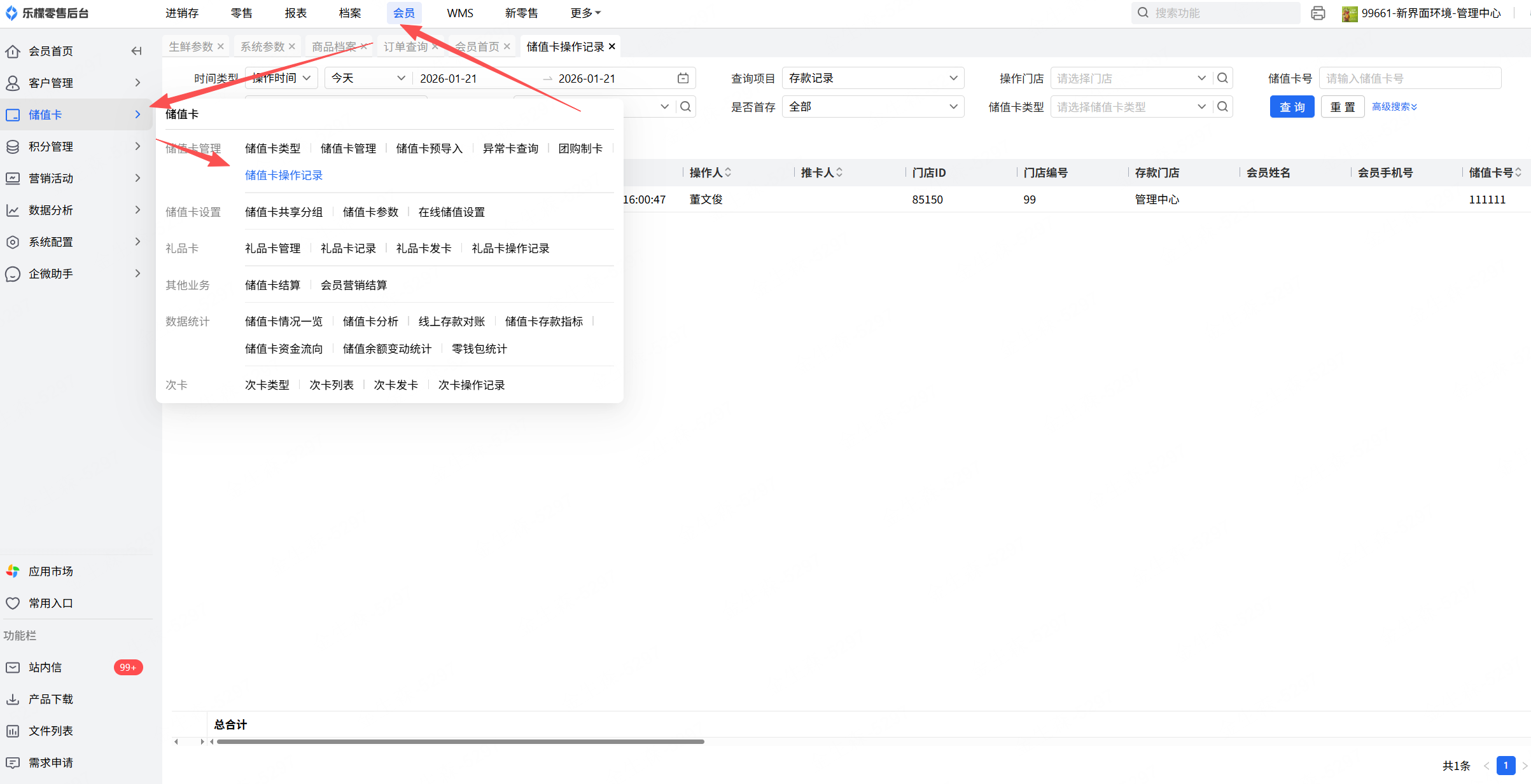 👉【操作路径】:WEB后台-会员-储值卡-储值卡操作记录