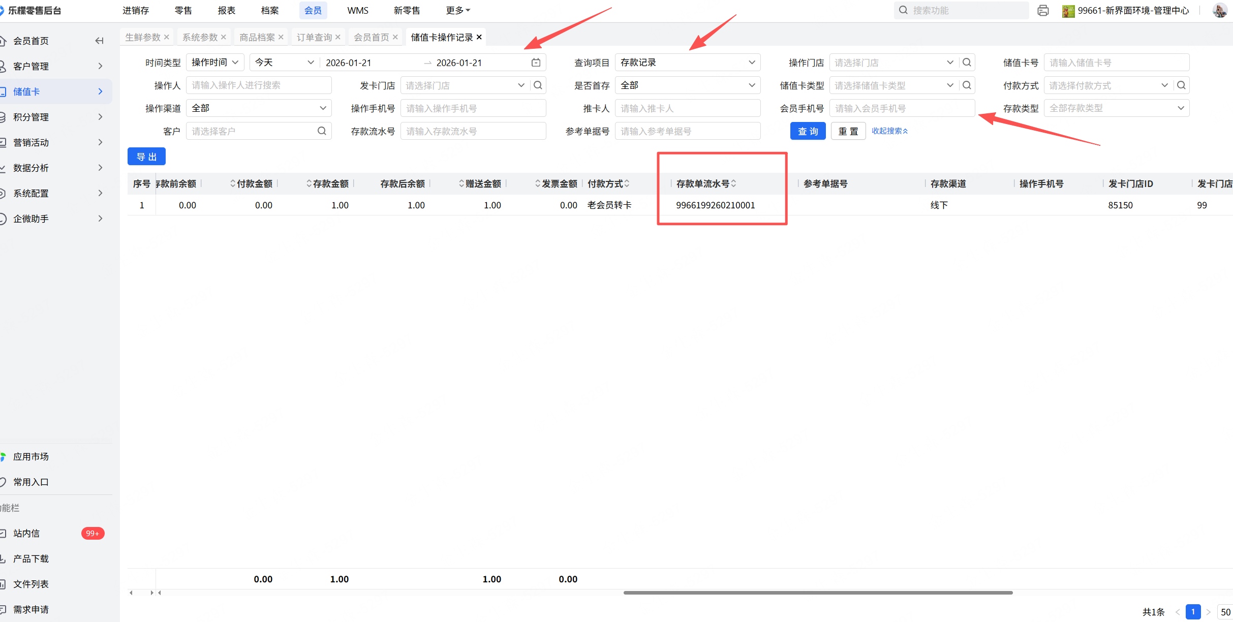 储值卡操作记录中查询范围选择“存款记录”,储值时间需要与客户确定,并在开始日期、结束如期选择对应的时间,再输入客户的会员卡号查询,获取存款流水号