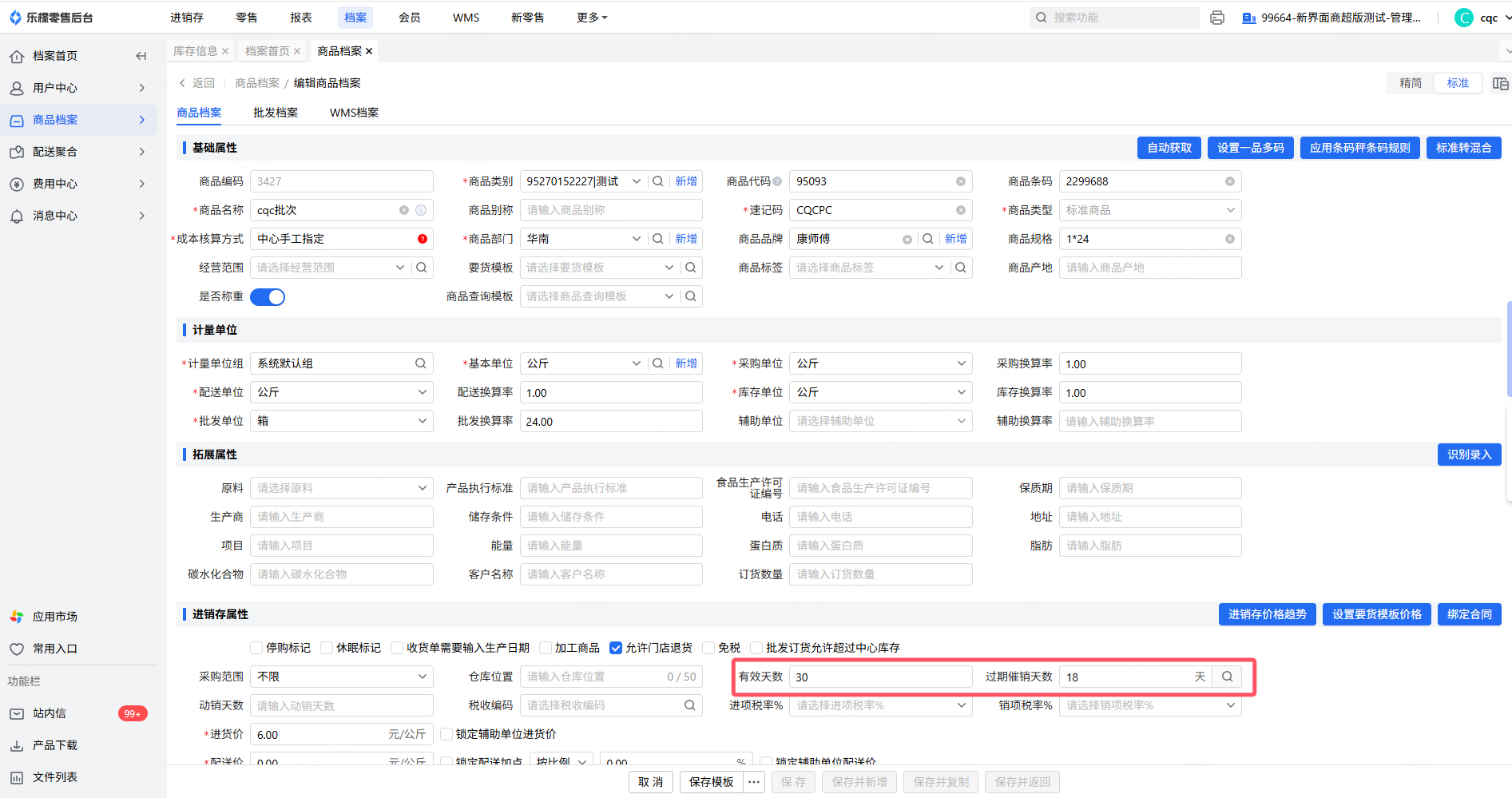 ①商品档案设置 有效天数(必填)、过期催销天数(根据需要选填)