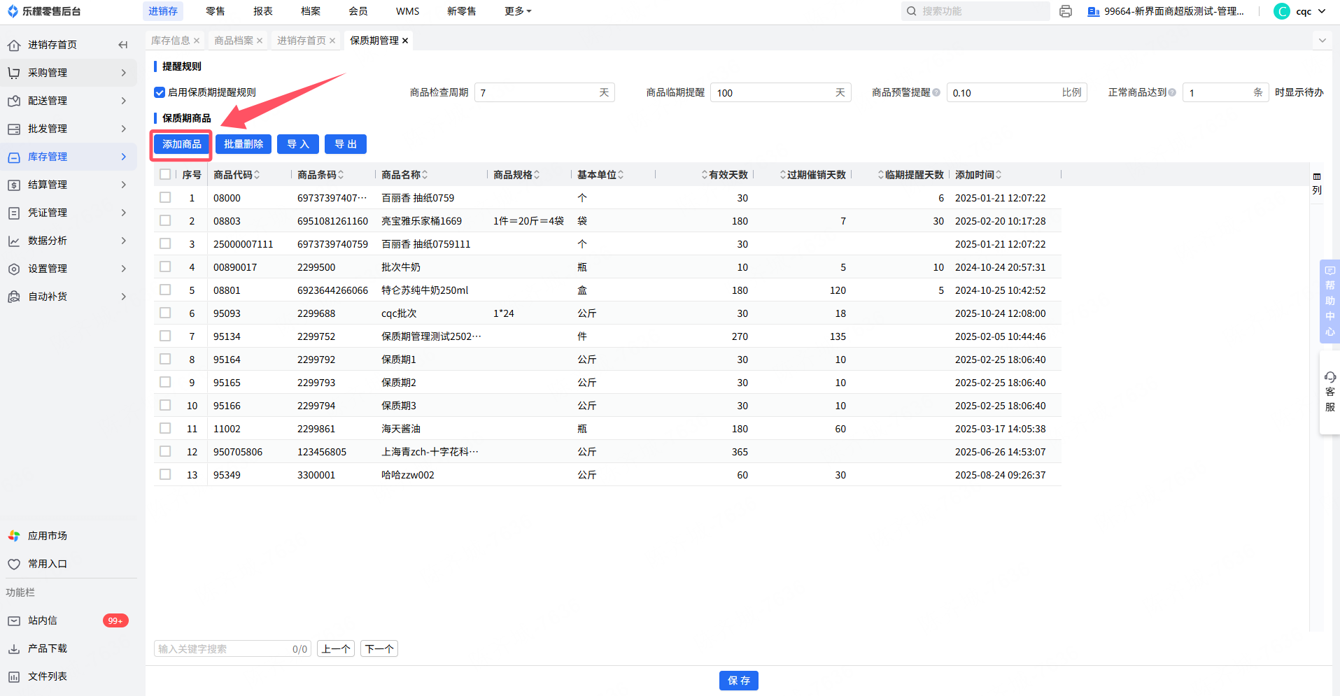 保质期管理里勾选启用保质期提醒,设置商品检查周期和商品临期提醒天数,这里设置检查周期为2天,临期检查天数为4天,同时把商品添加到保质期商品列表里;