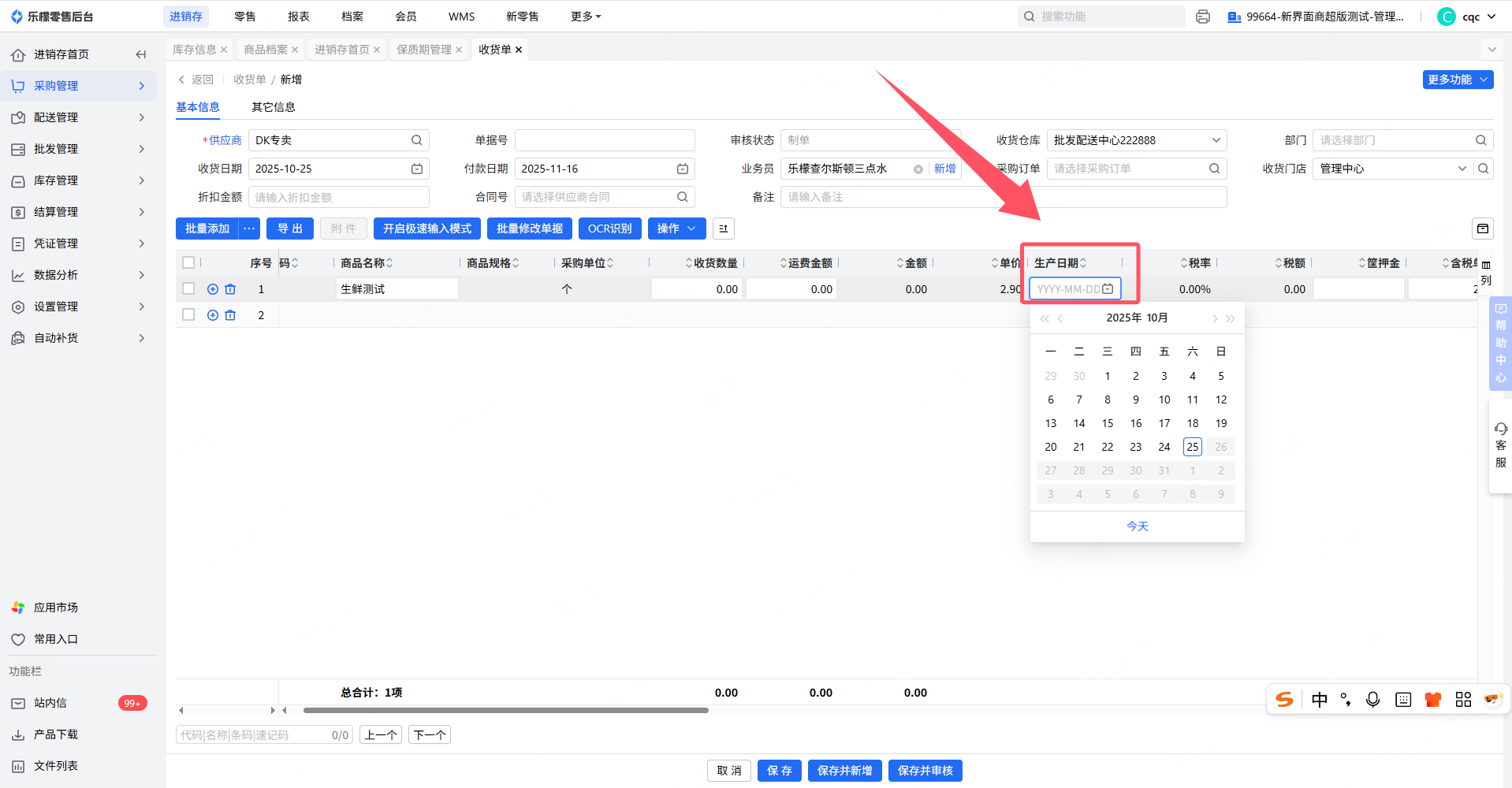 ③.商品做收货单或者调入单,入库后会自动根据到期天数生成到期日期、临期日期、催销日期和预警日期。