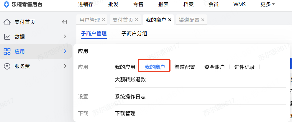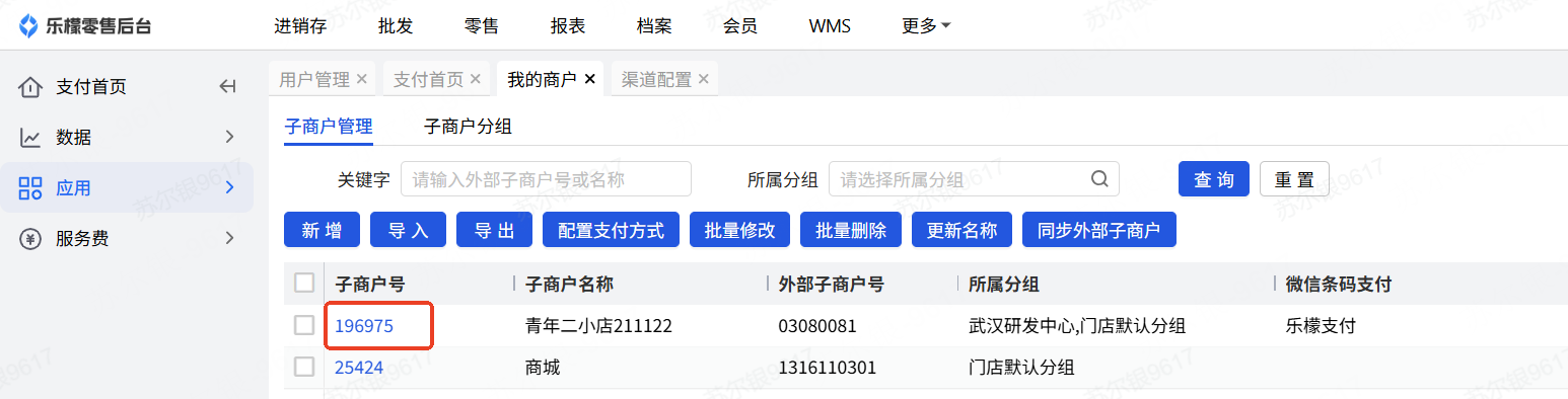 网页后台-乐檬支付-应用-我的商户-子商户号 点击子商户号进入查询;如图4就是扫呗的渠道