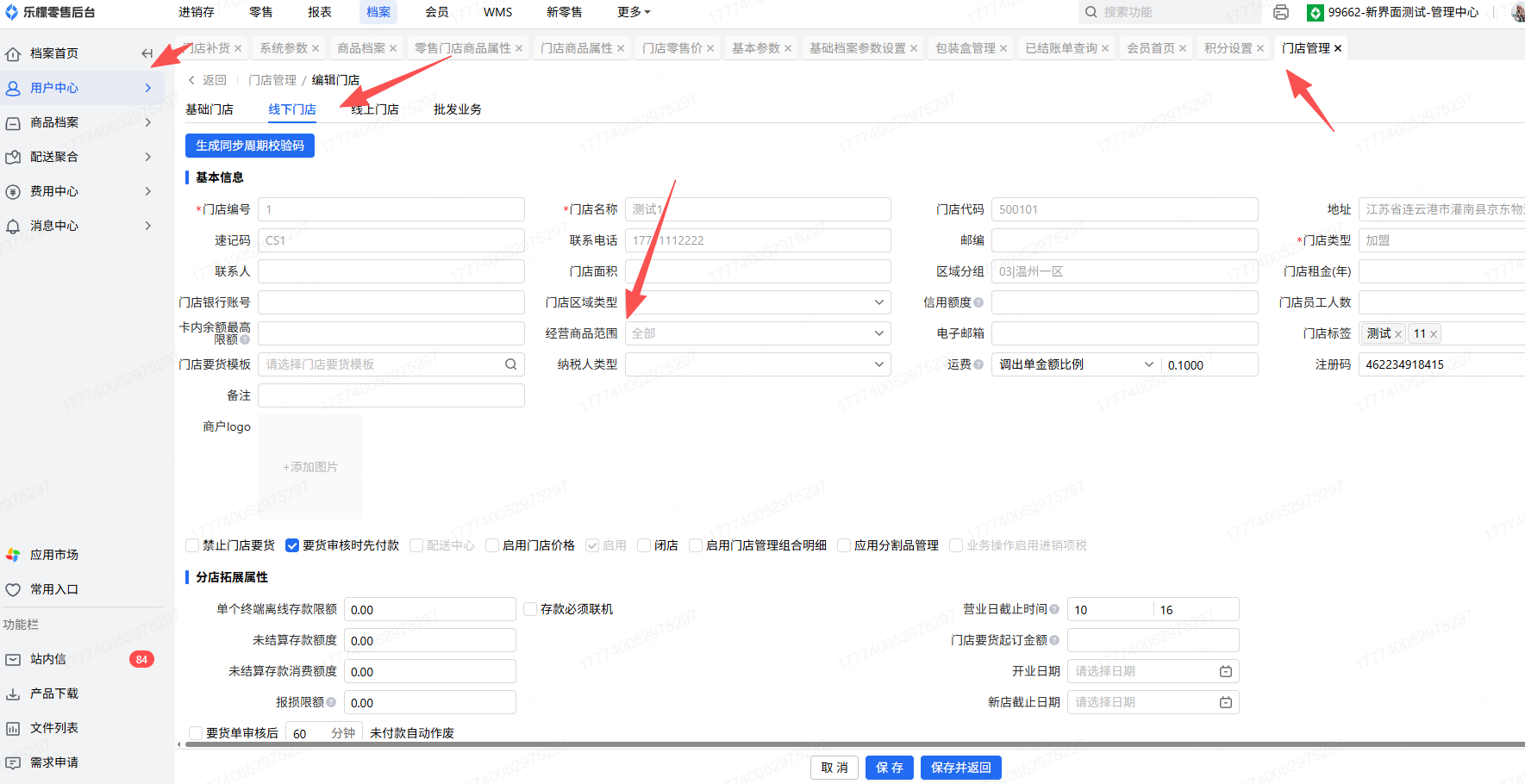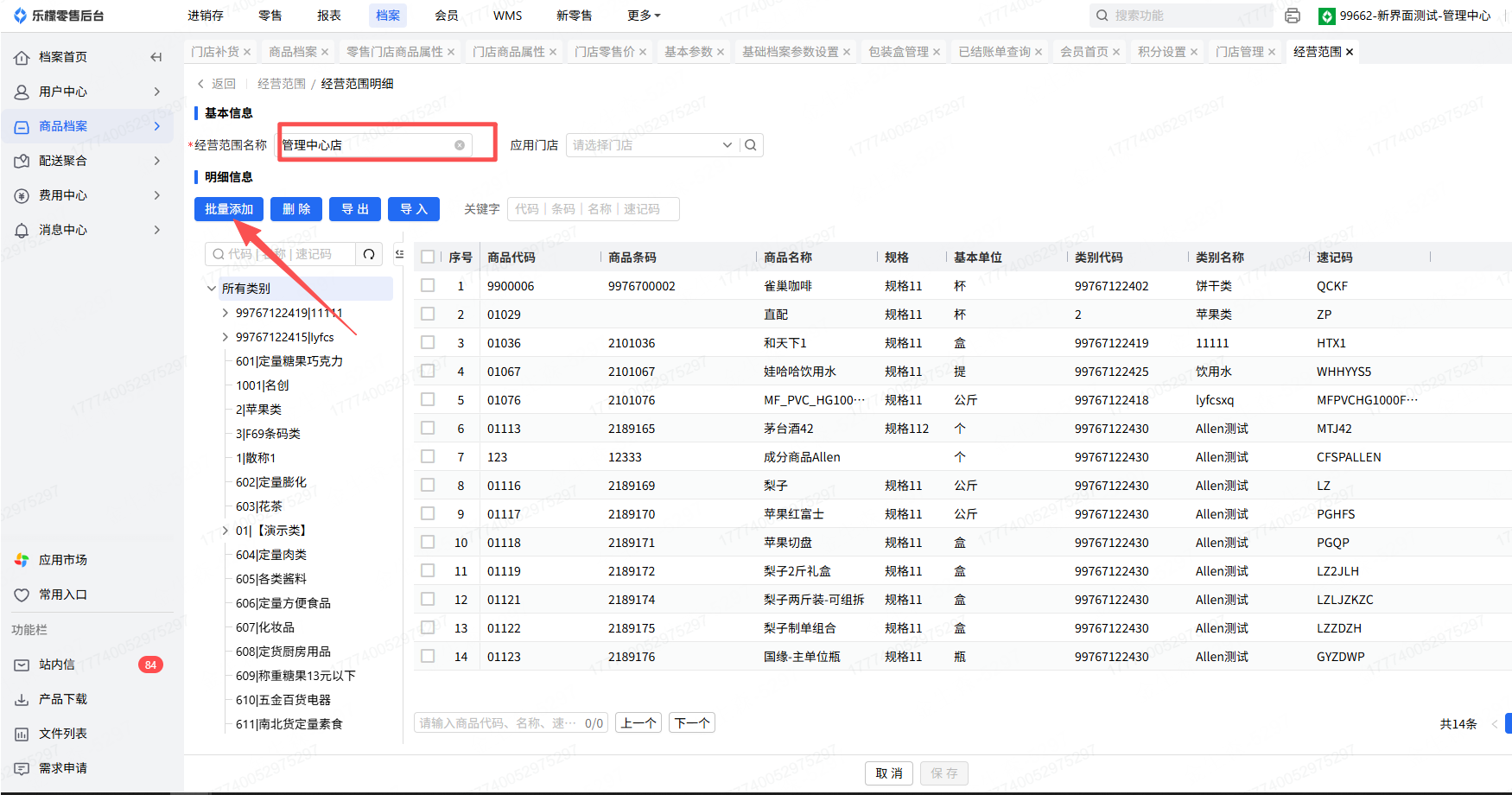 1.查询是否设置了门店经营范围;档案-用户中心-门店管理-门店编号点击进入,查询此门店的经营范围商品。