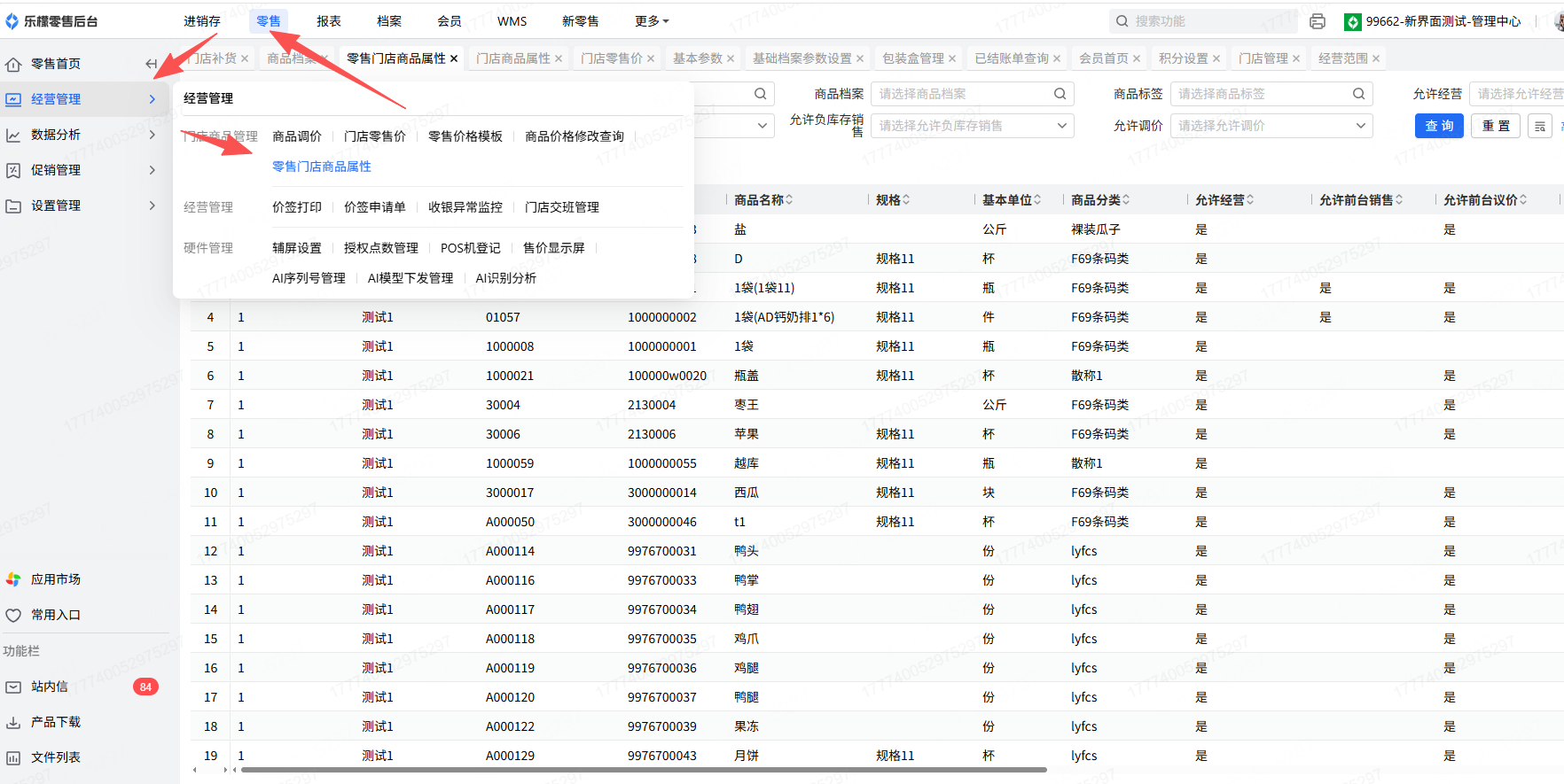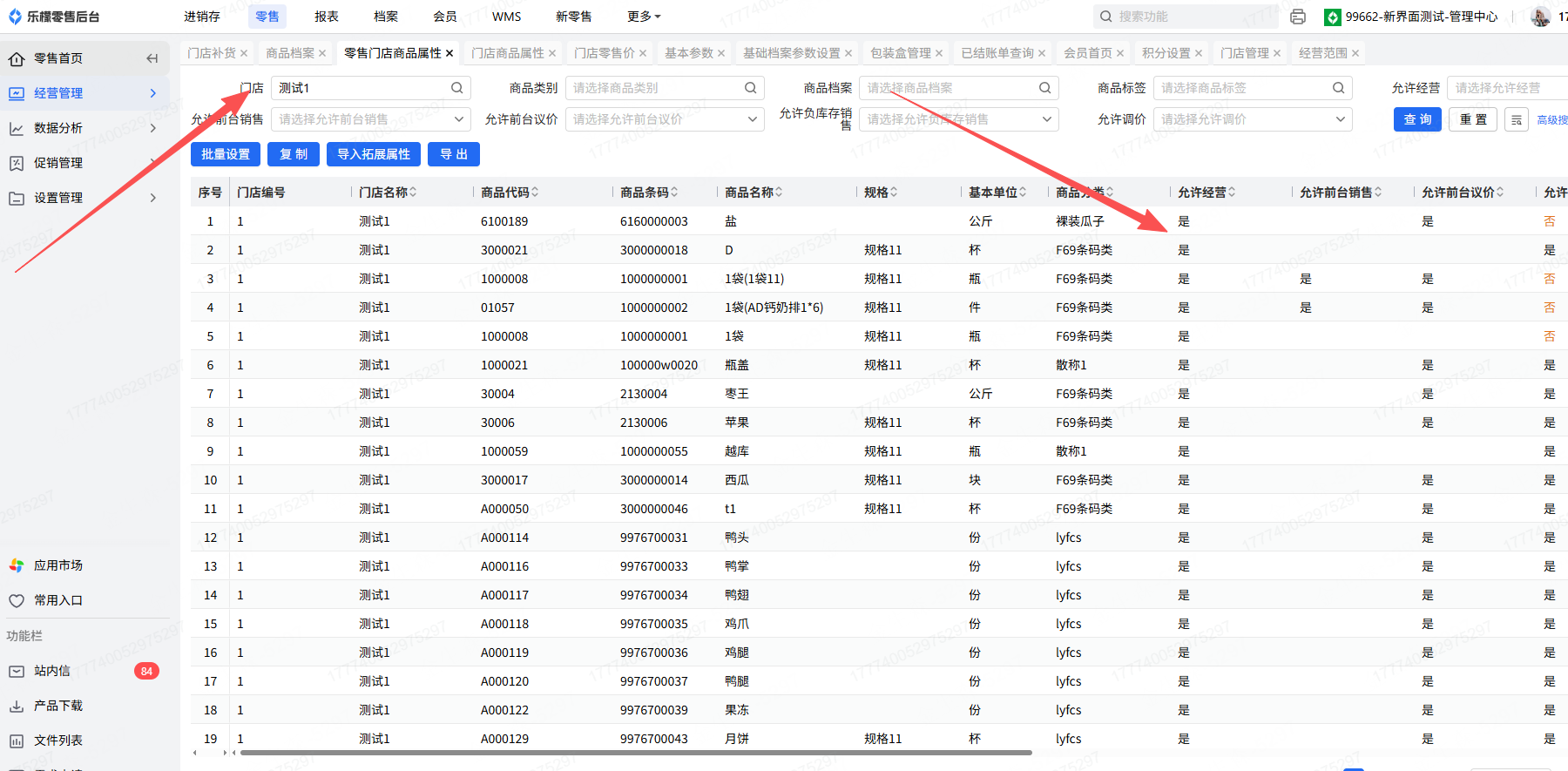 零售-经营管理-零售门店商品属性,选择对应门店和商品,查询允许经营列,如显示“否”,单击改为“是”或为空