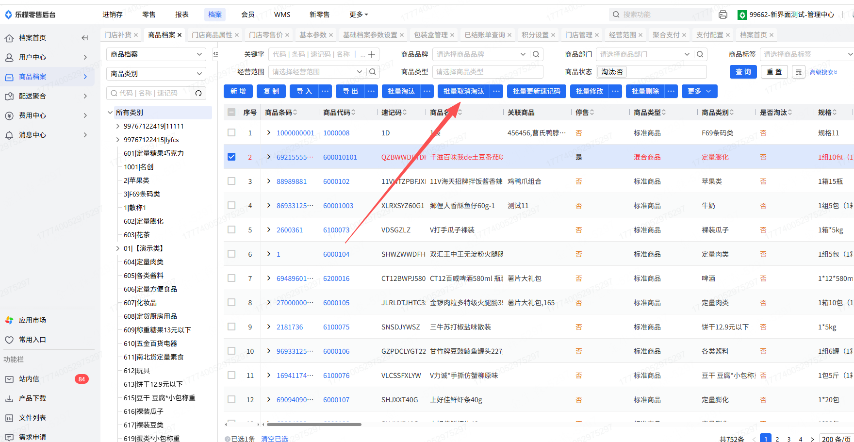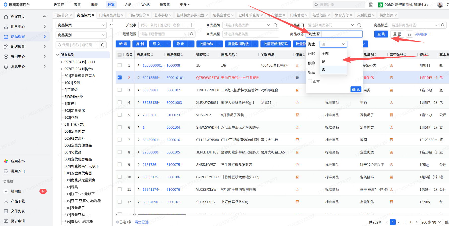 档案-商品档案-淘汰商品,点击查询后,上方显示的是正常商品,分界线下面显示的是淘汰商品,勾选淘汰商品点击恢复