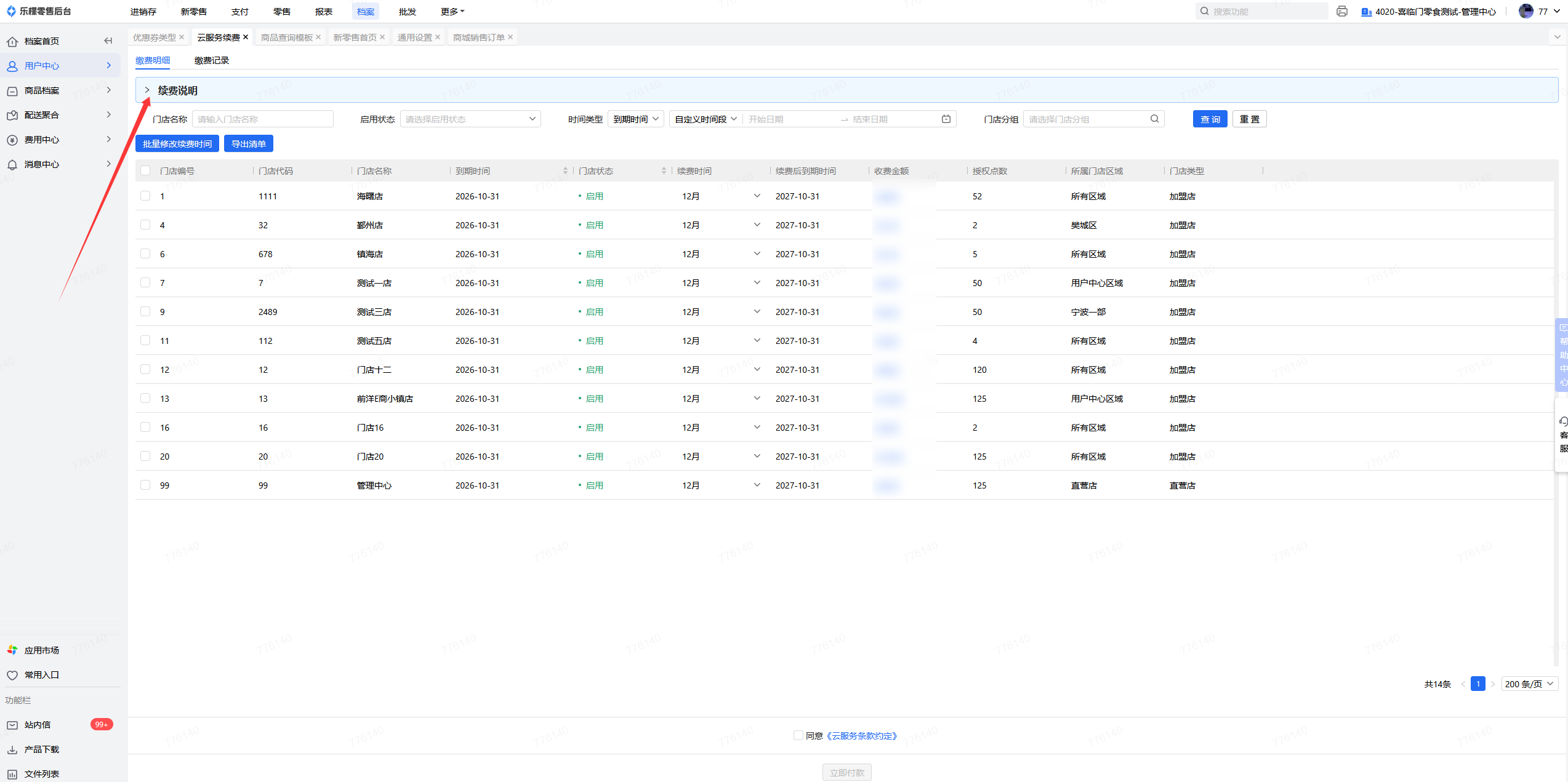 1、点击门店续费按钮,仅展示距离到期时间一个月内的门店