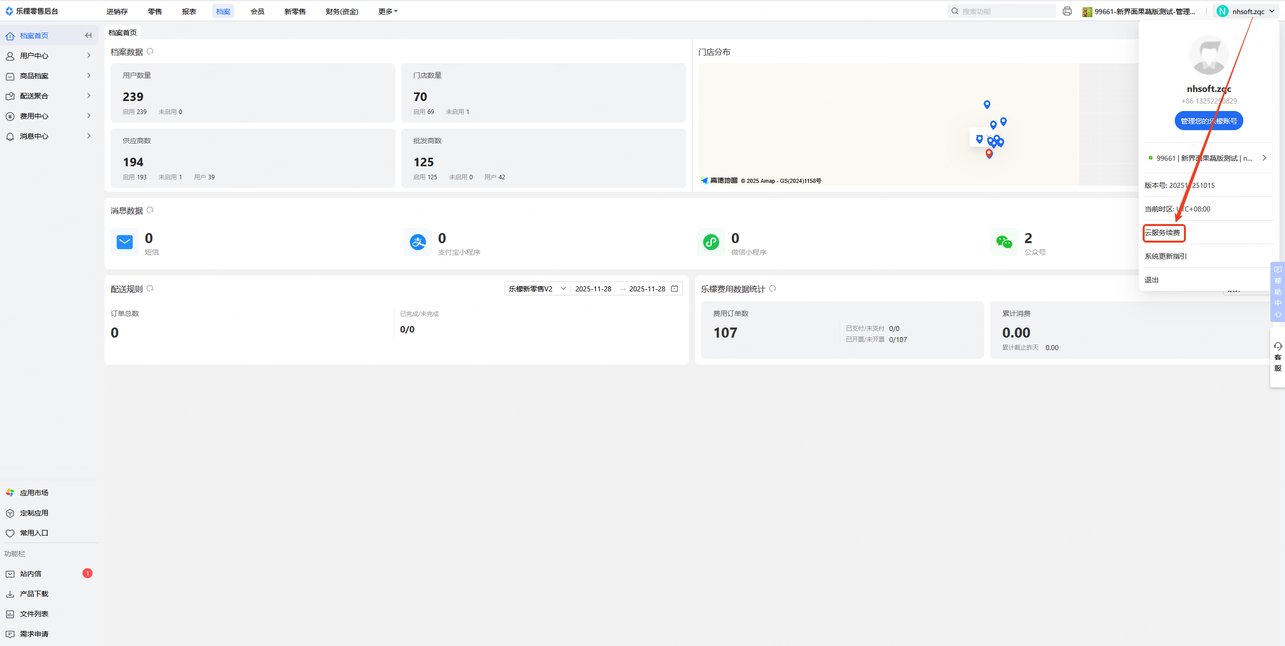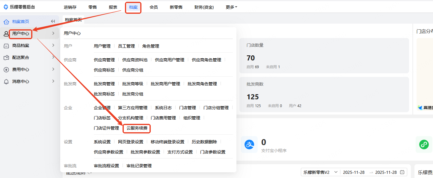 1.路径①:登录网页版后台,点击右上角登录账号名称,会弹出下拉窗口,点击云服务费。(注意:管理中心门店登录才行);
