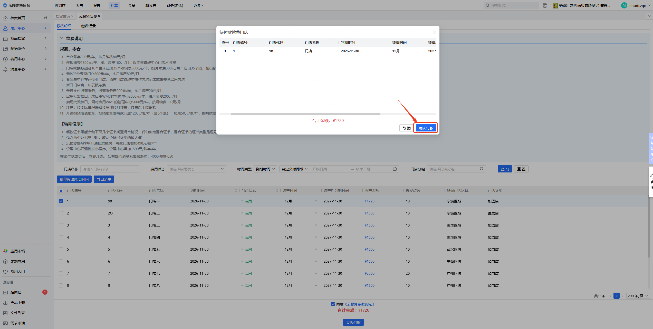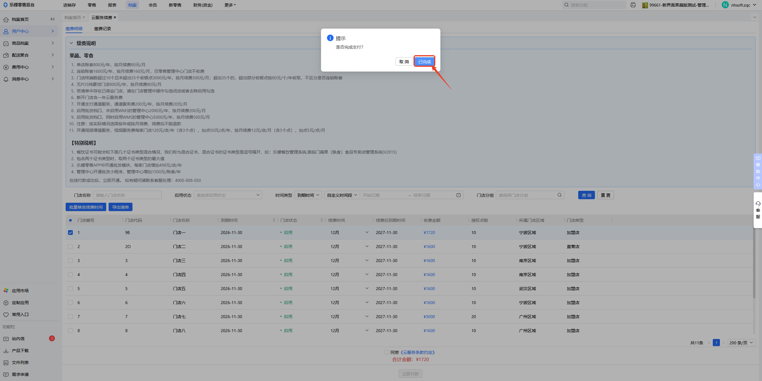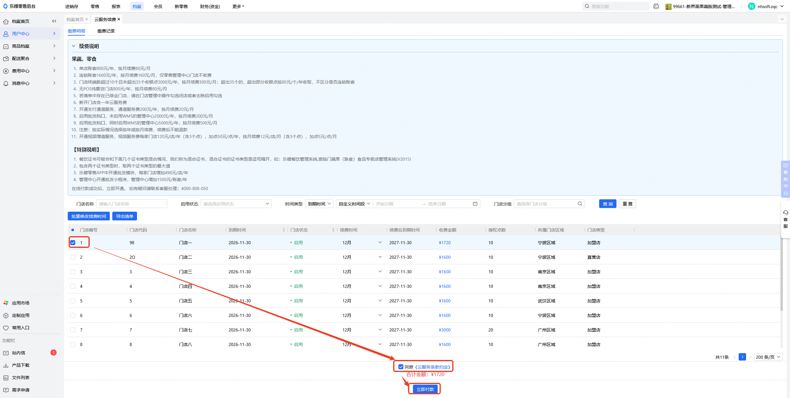 勾选需要续费的门店,并勾选“同意云服务条款约定”点击立即付款;