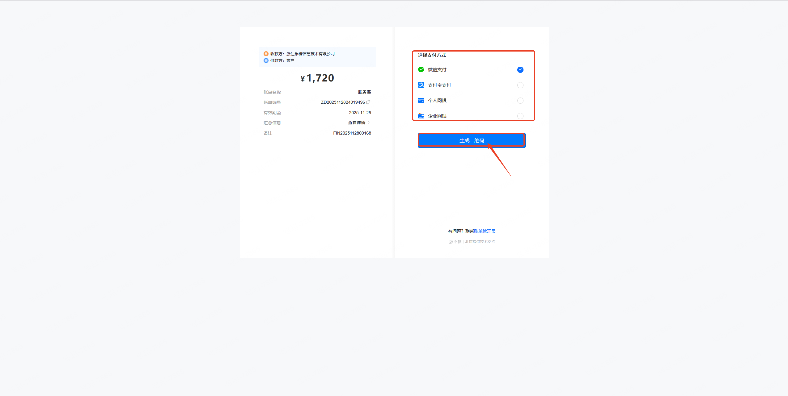 选择支付方式,如果是选择微信支付宝支付,点击生成二维码,用微信支付宝扫码完成付款