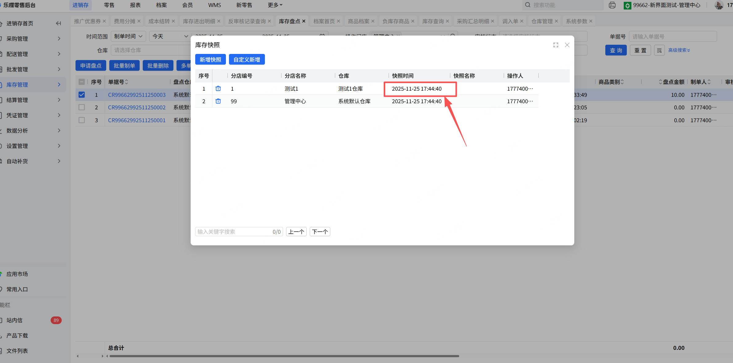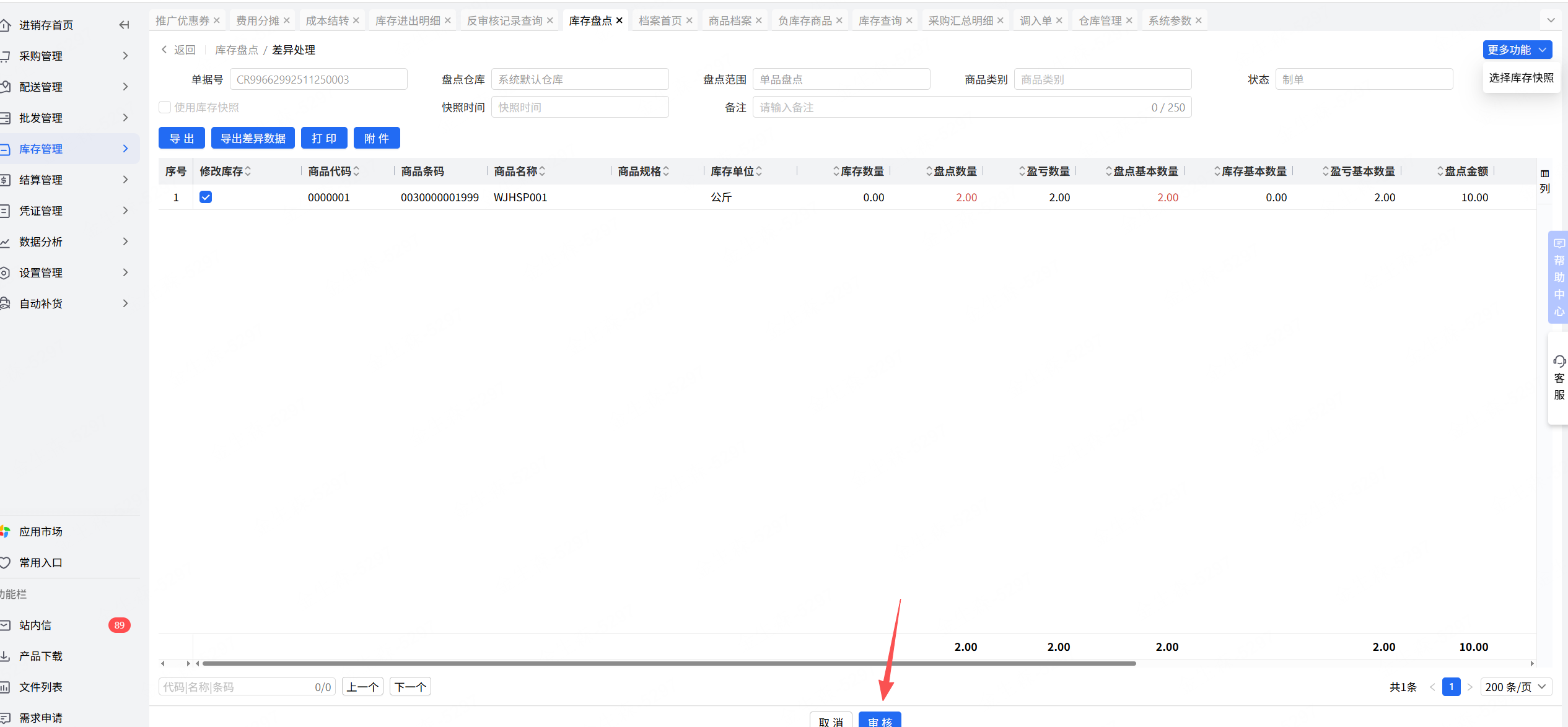 差异处理界面,选择库存快照新增的库存快照后,不能点击审核,要点击返回,审核完会立即生效,无法再去操作多单合并。