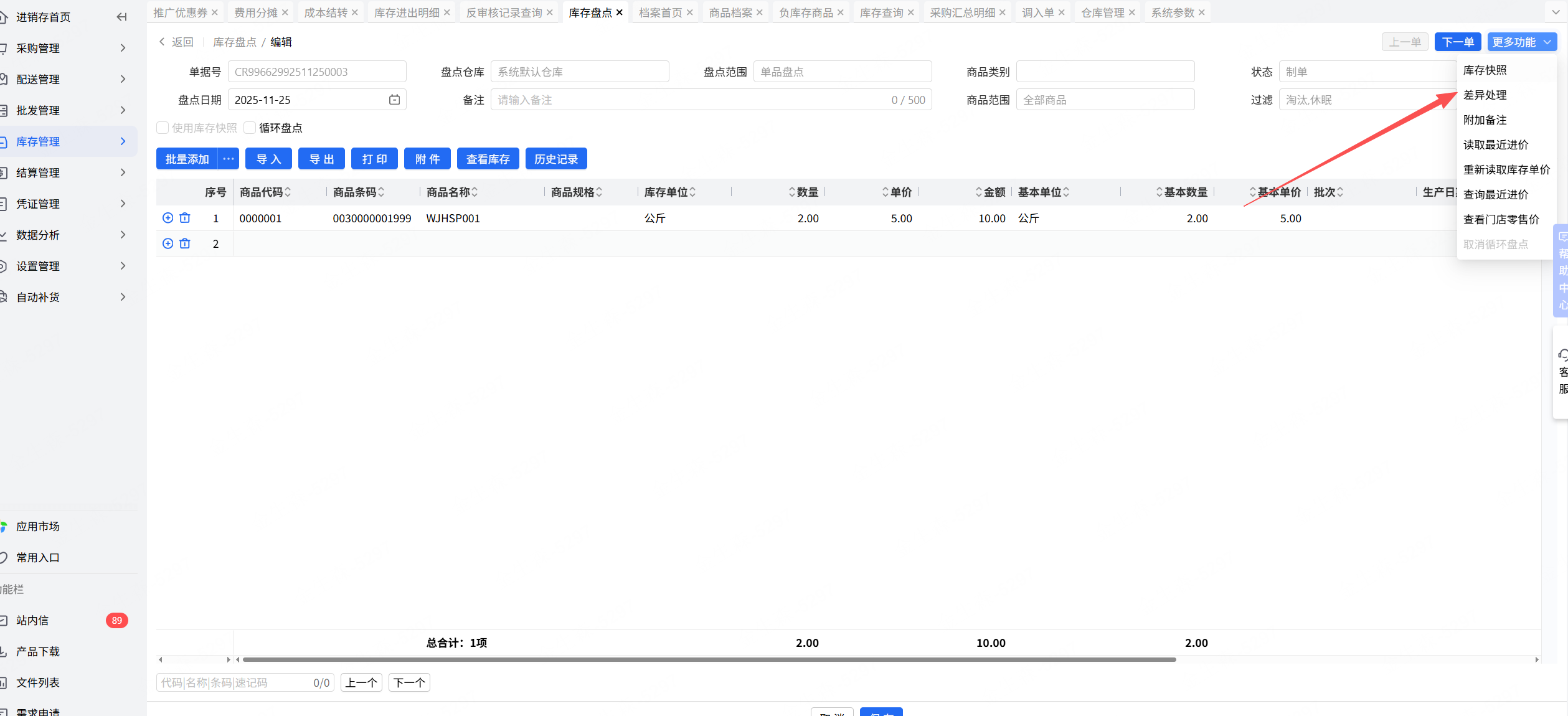 盘点差异处理提示手工指定商品****库存不足,无法操作