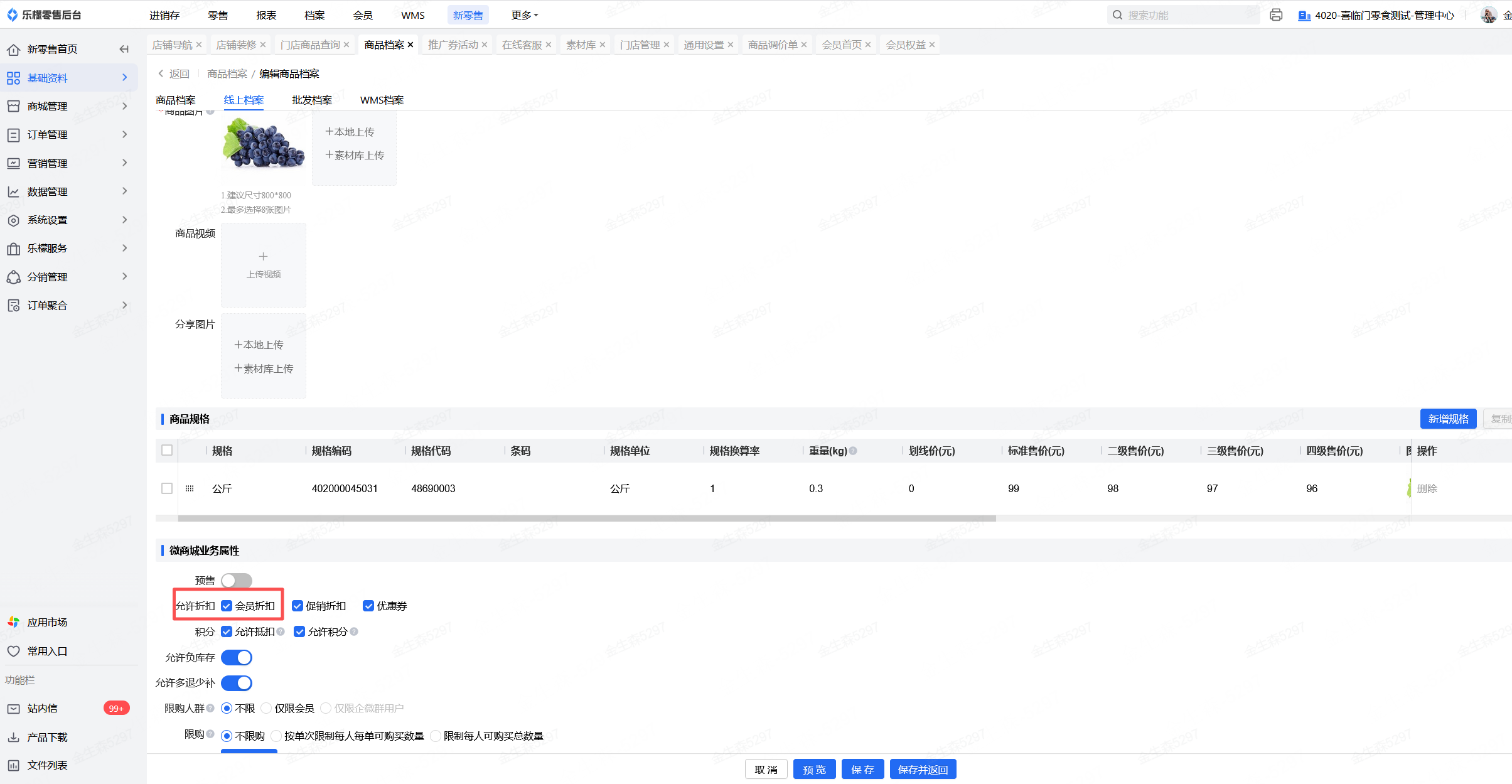 对应商品没有勾选会员折扣参数 | 进入途径:新零售-基础资料-商品档案,点击对应活动商品-会员折扣、优惠券打勾 | |