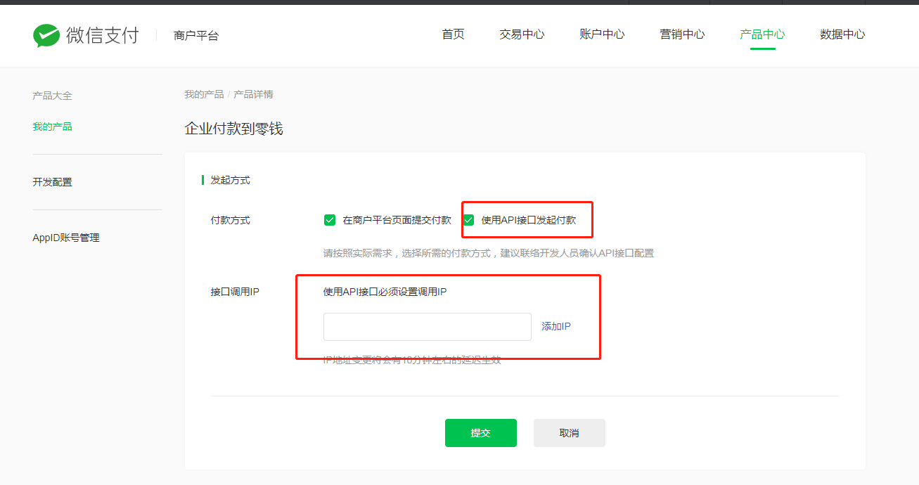 设置路径:商户平台 (opens new window)-> 产品中心 -> 运营工具 -> 商家转账到零钱/商家转账 -> 前往功能 -> 接口安全。