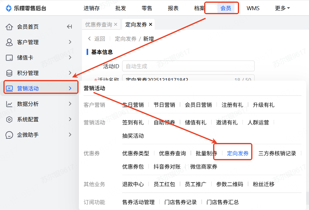 👉【操作路径】:会员-营销活动-定向发券-新增定向发券