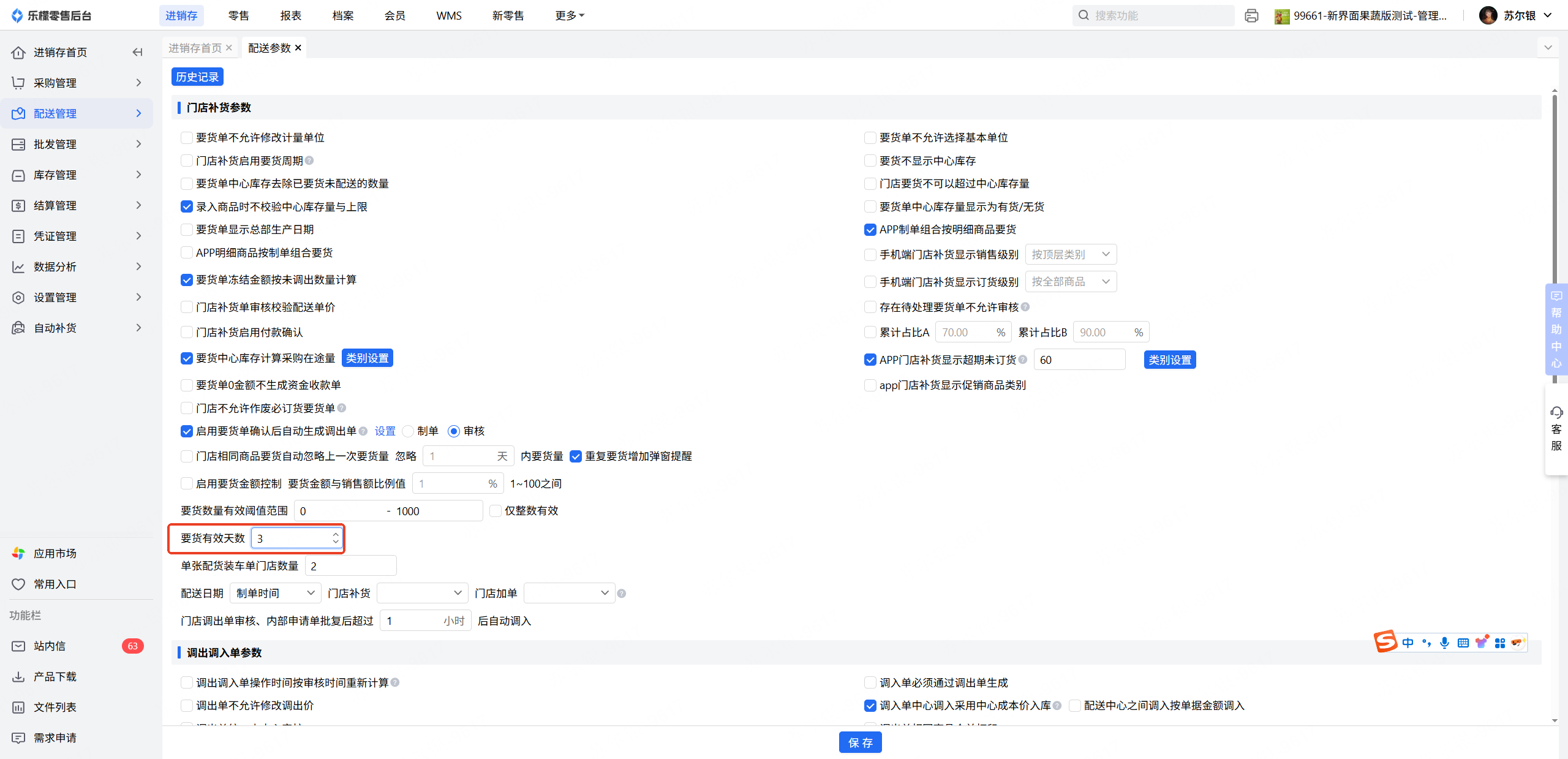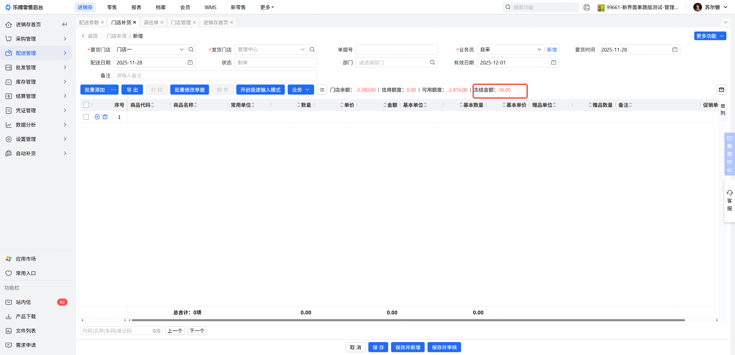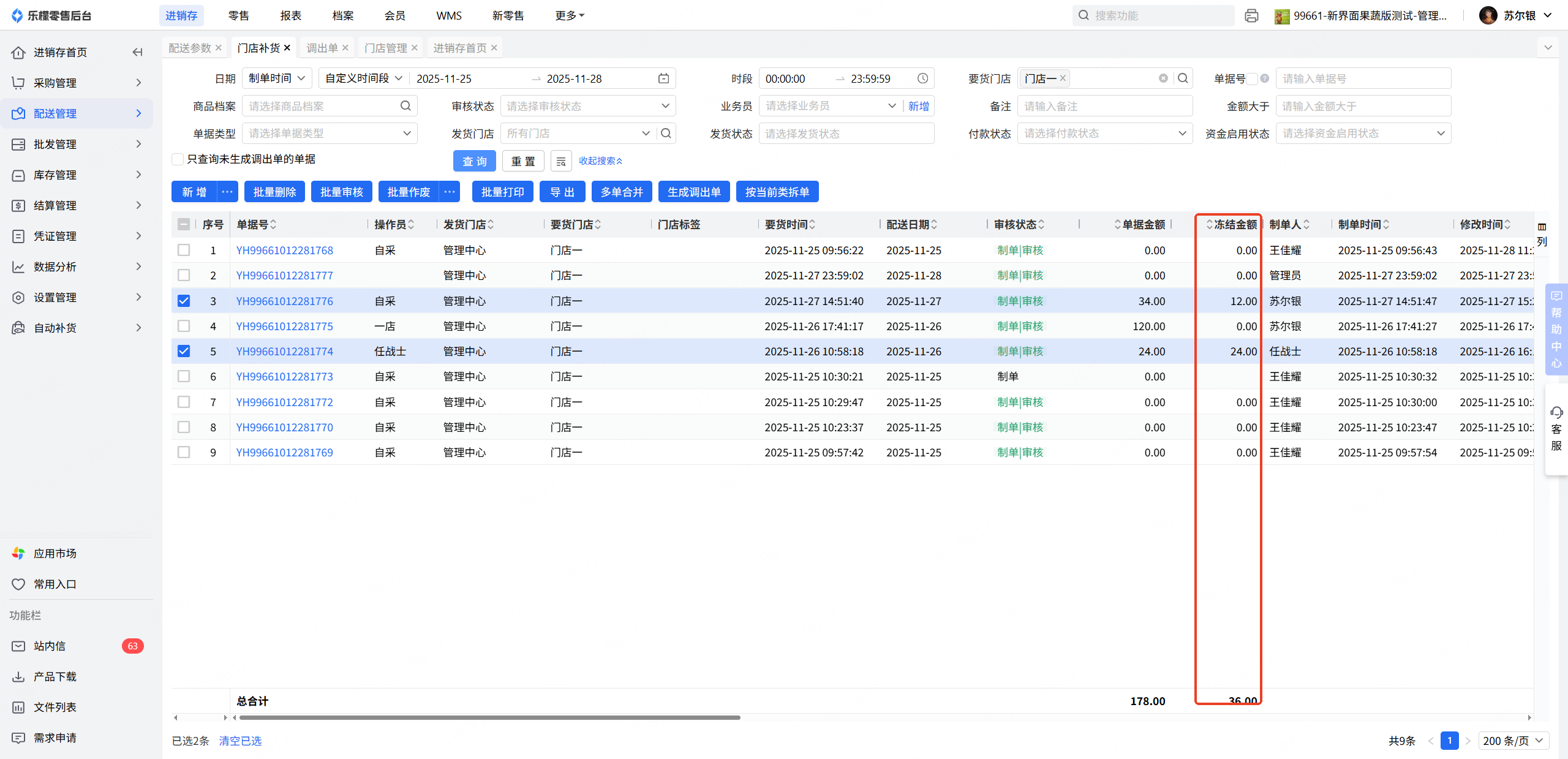 2.查询冻结金额:先看档案-配送参数,要货单的有效期是多久,再去门店补货筛选,开始时间(今天-有效天数)-结束时间(今天),发货状态(待处理);注意要货单已生成调出单,但是调出单未审核的单据还是会计算冻结金额。