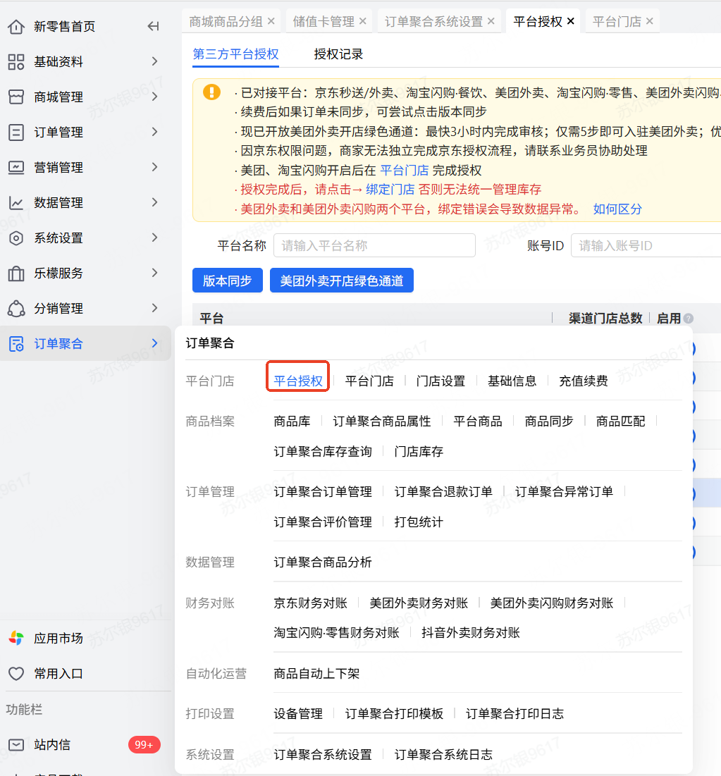 先到订单聚合-基础设置-平台授权中先开启饿了么外卖、美团外卖功能
