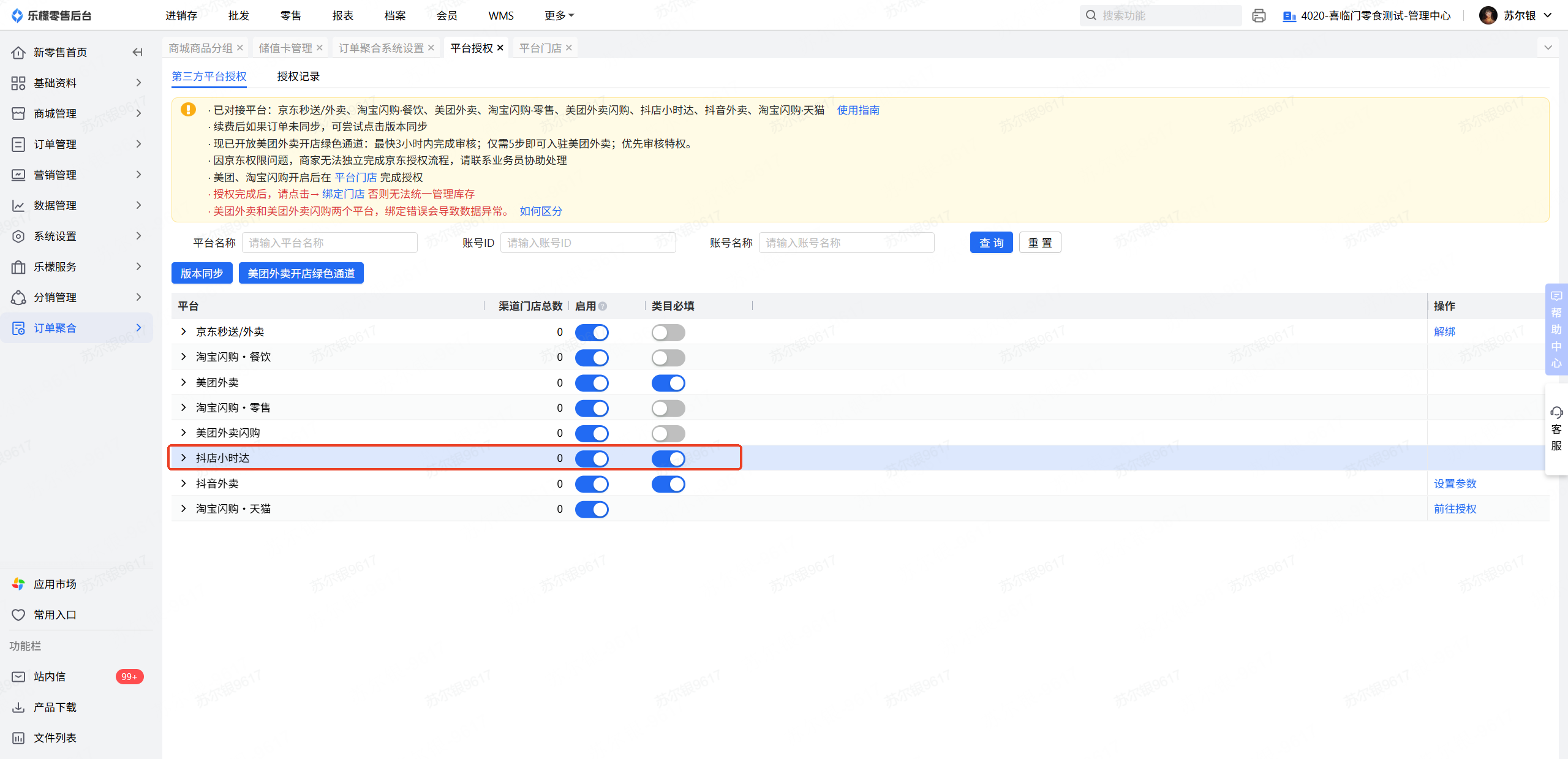 先到订单聚合-基础设置-平台授权中开启抖店小时达功能