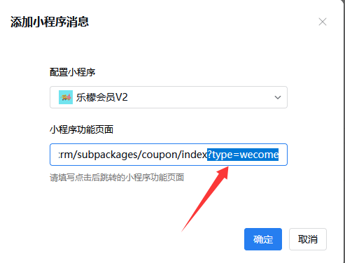 例:pages/crm/subpackages/coupon/index?type=wecome