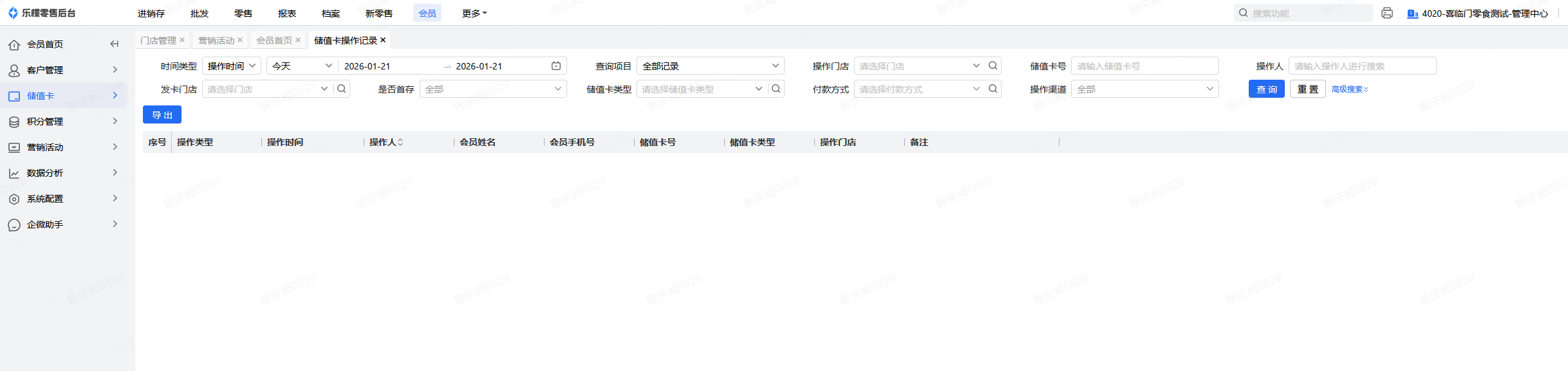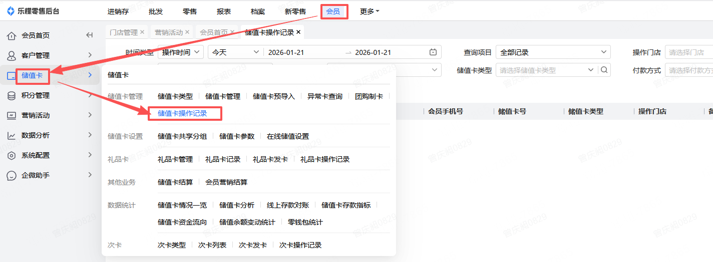 👉【操作路径】:会员-储值卡-储值卡操作记录