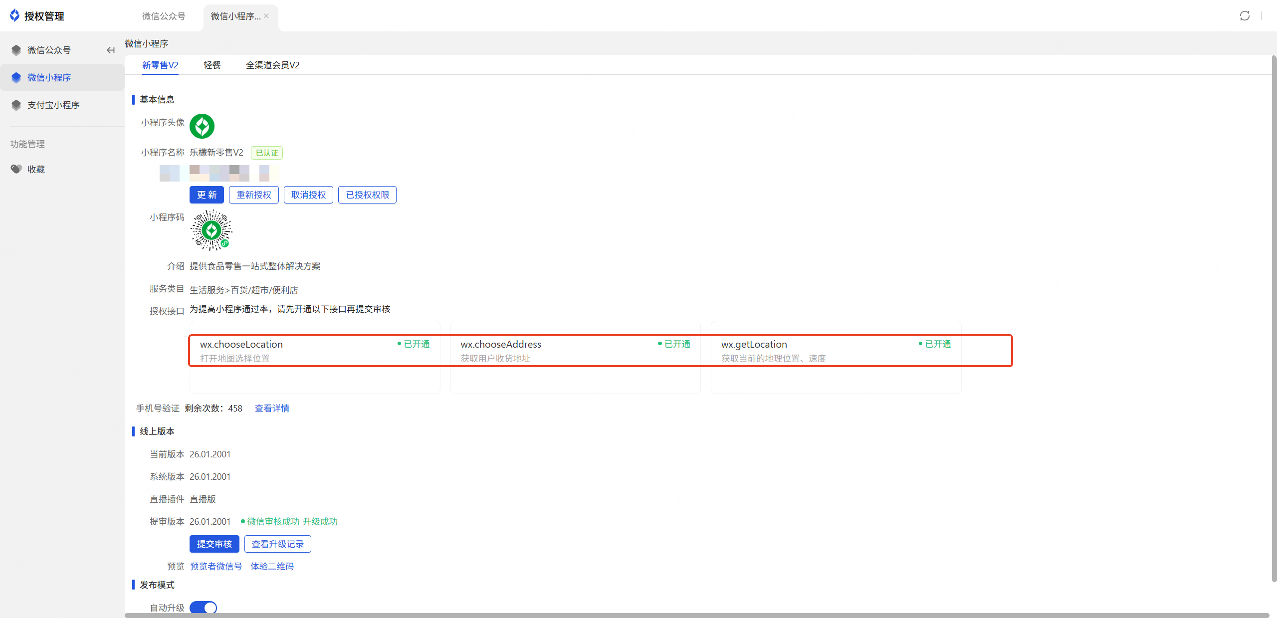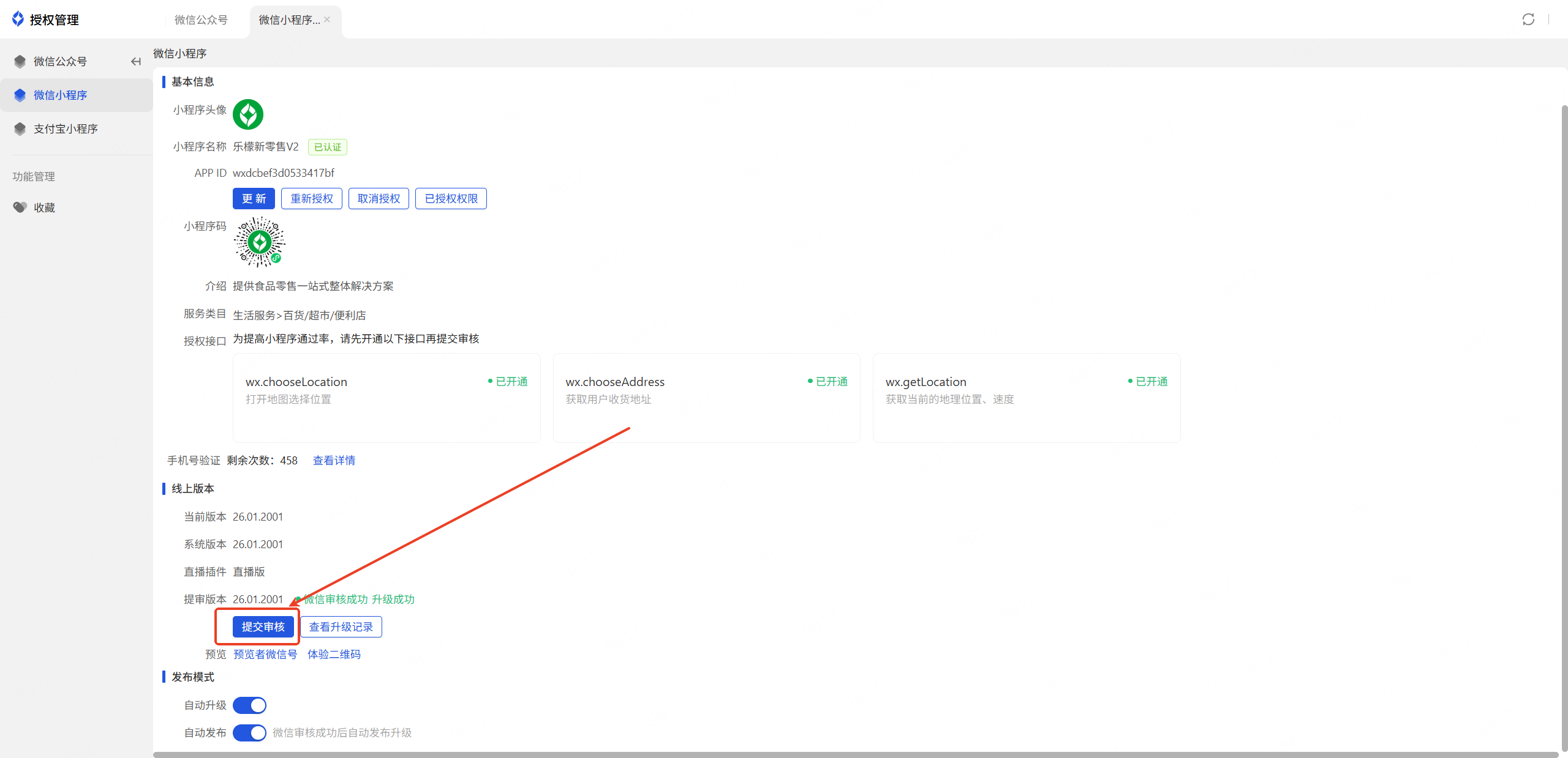 最后等待认证、接口审核通过,再回到授权管理界面点击提交审核,审核通过后即可正常使用小程序
