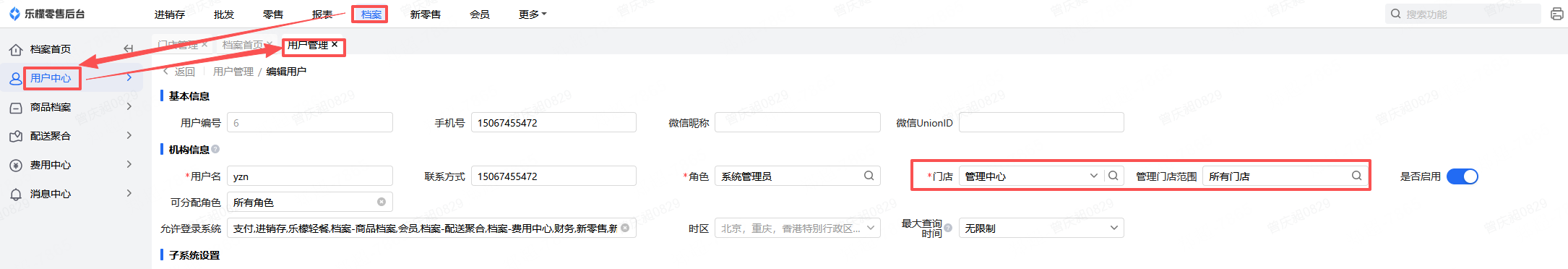 2、若用户无法查看到想要不启用的门店,需要检查档案中心-用户管理中用户的门店分组管理是否为所有门店