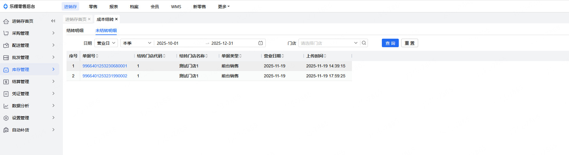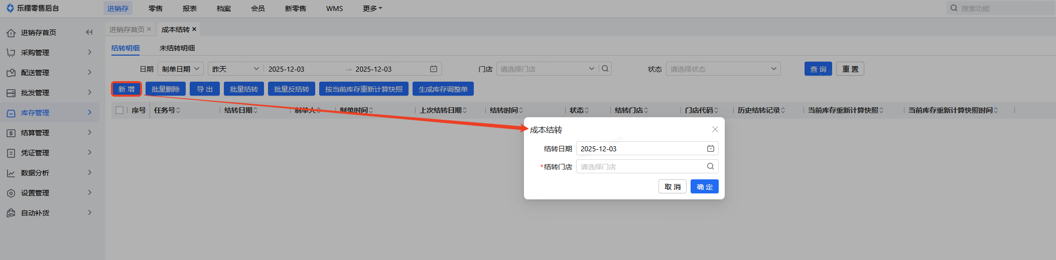 在门店管理里可设置自动结转。设定好之后,每天到了设定的时间点将生成结转单并执行结转。