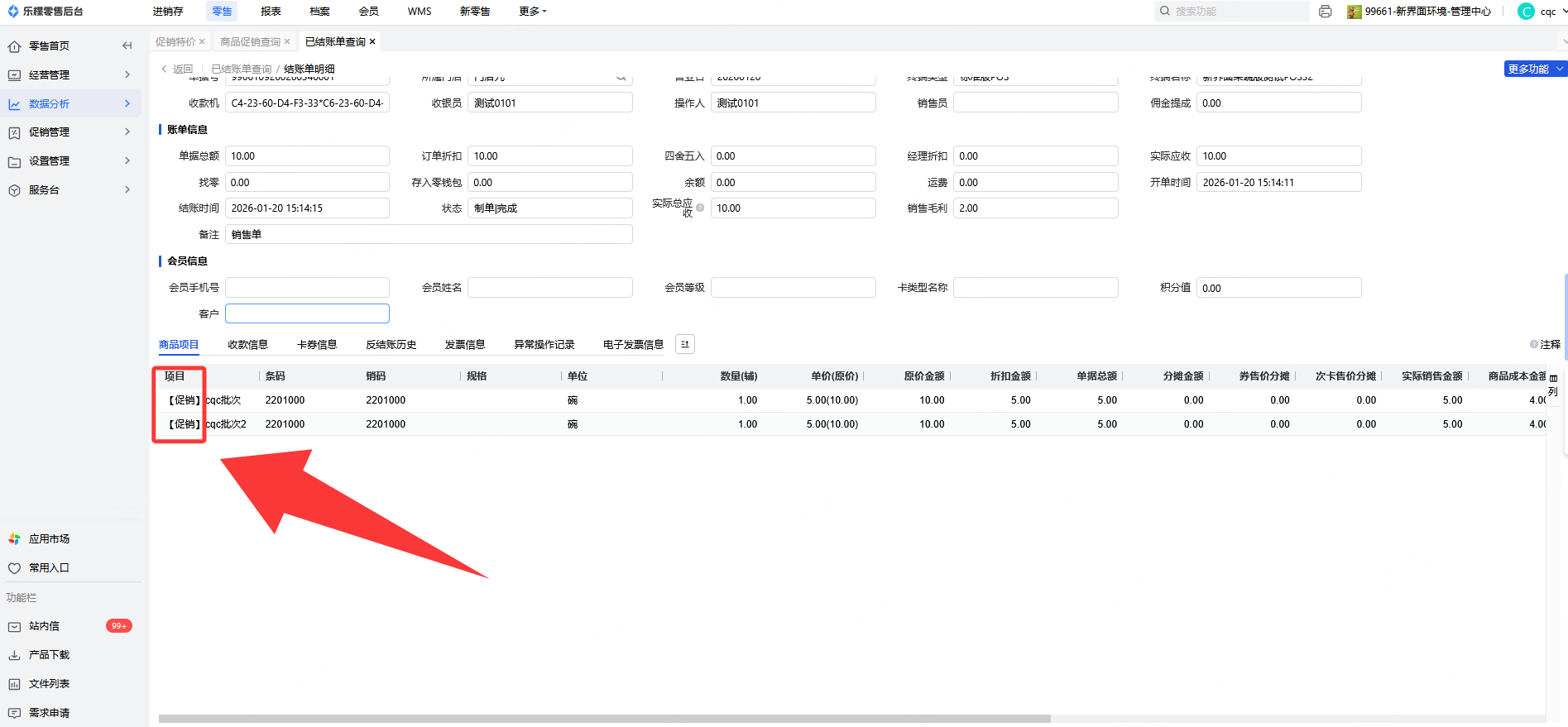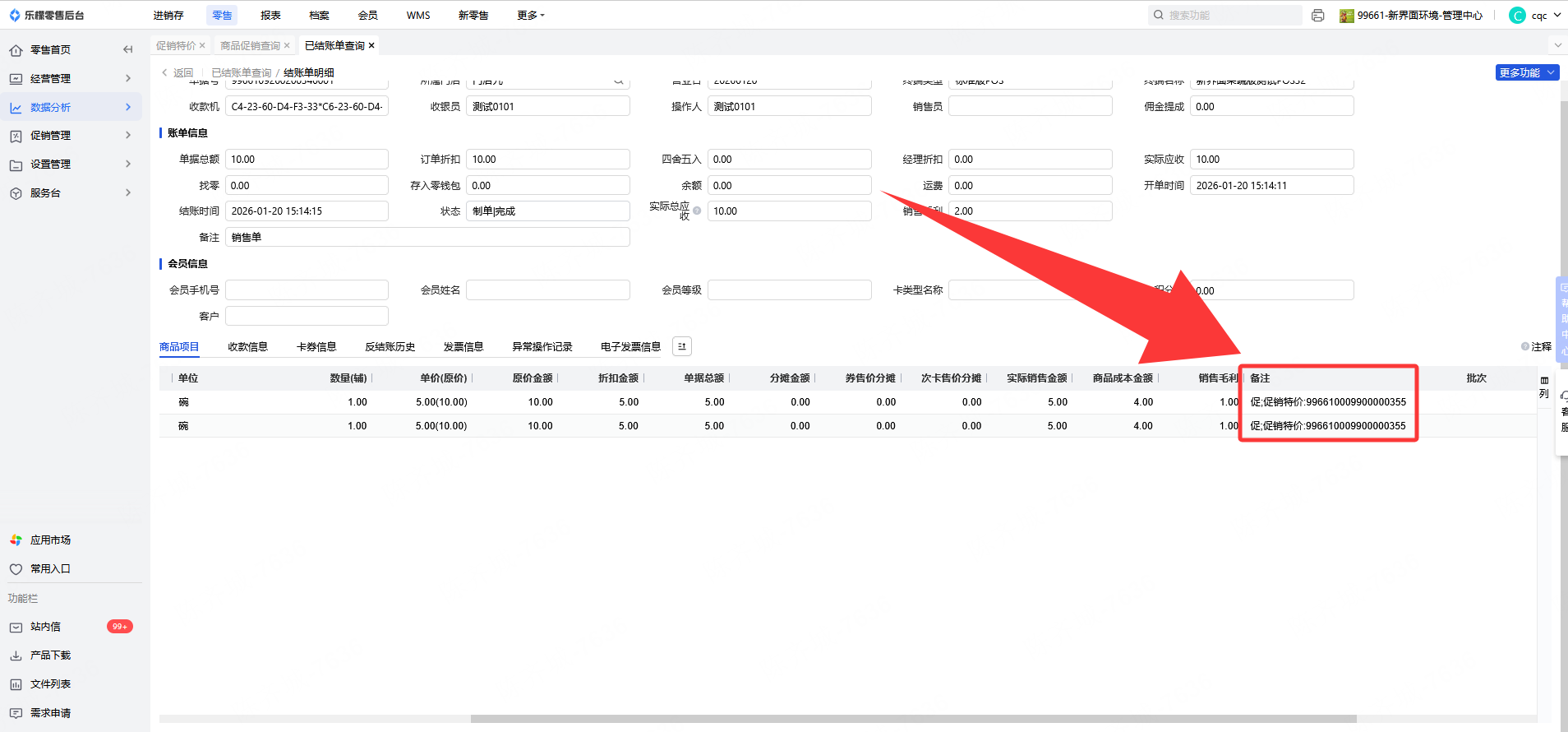 2、可通过已结账单内的促销单号查询,这个适合活动太多无法确定是哪个活动再生效