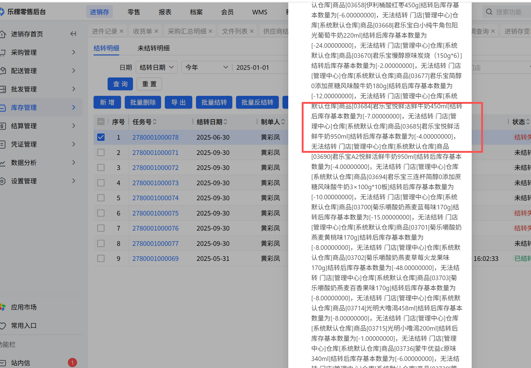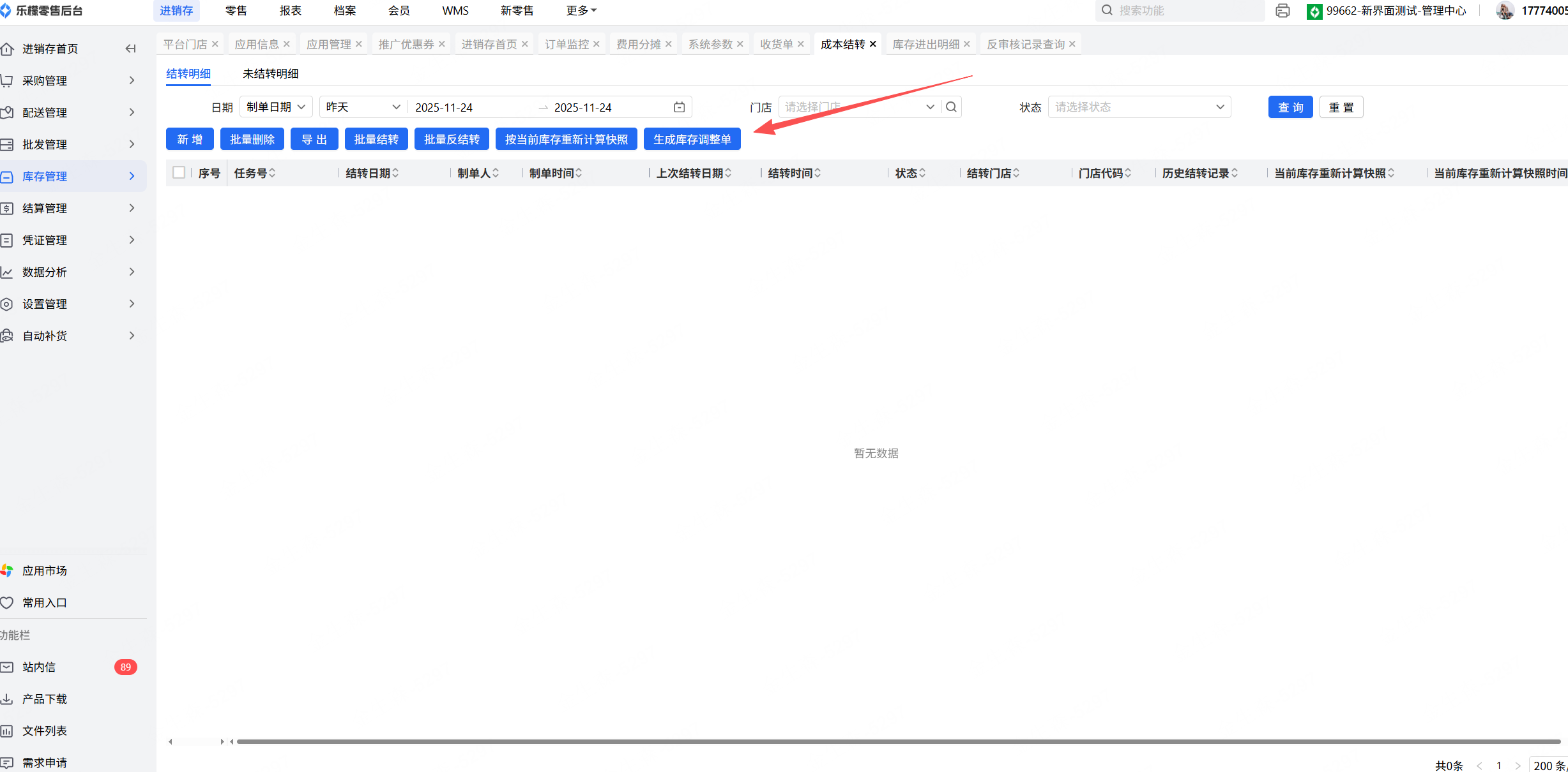 👉【操作路径】:1.勾选对应失败的成本结转单,点击生成库存调整单