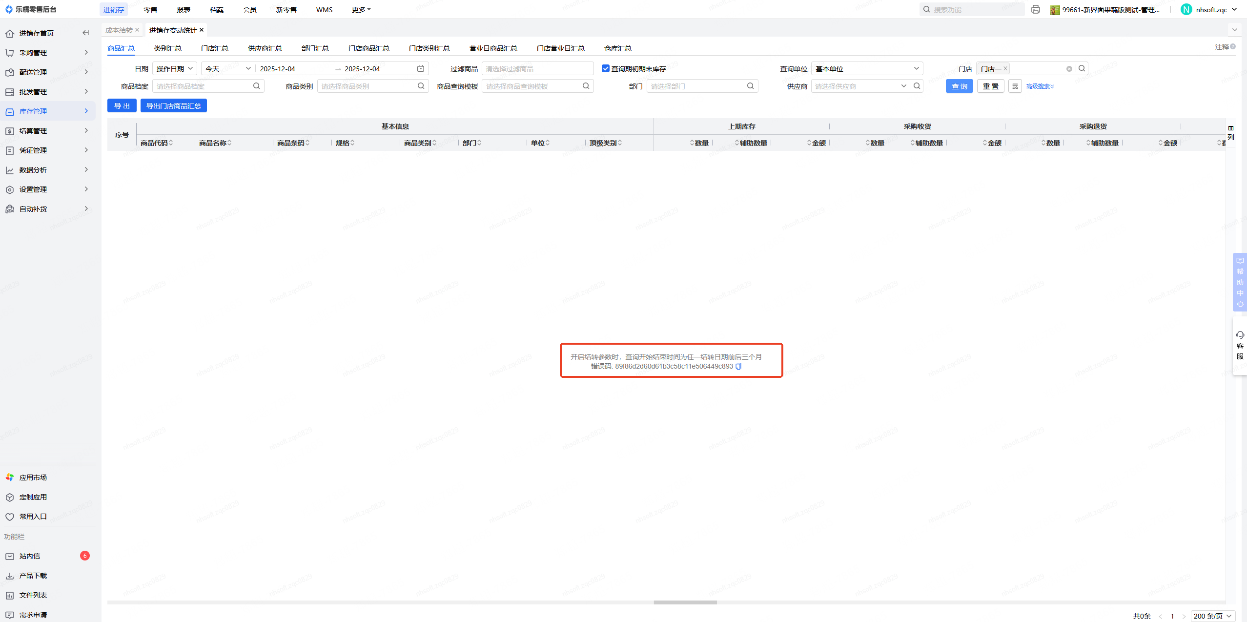 进销存变动统计查询时,提示:开启结转参数时,查询开始结束时间为任一结转日期前后三个月