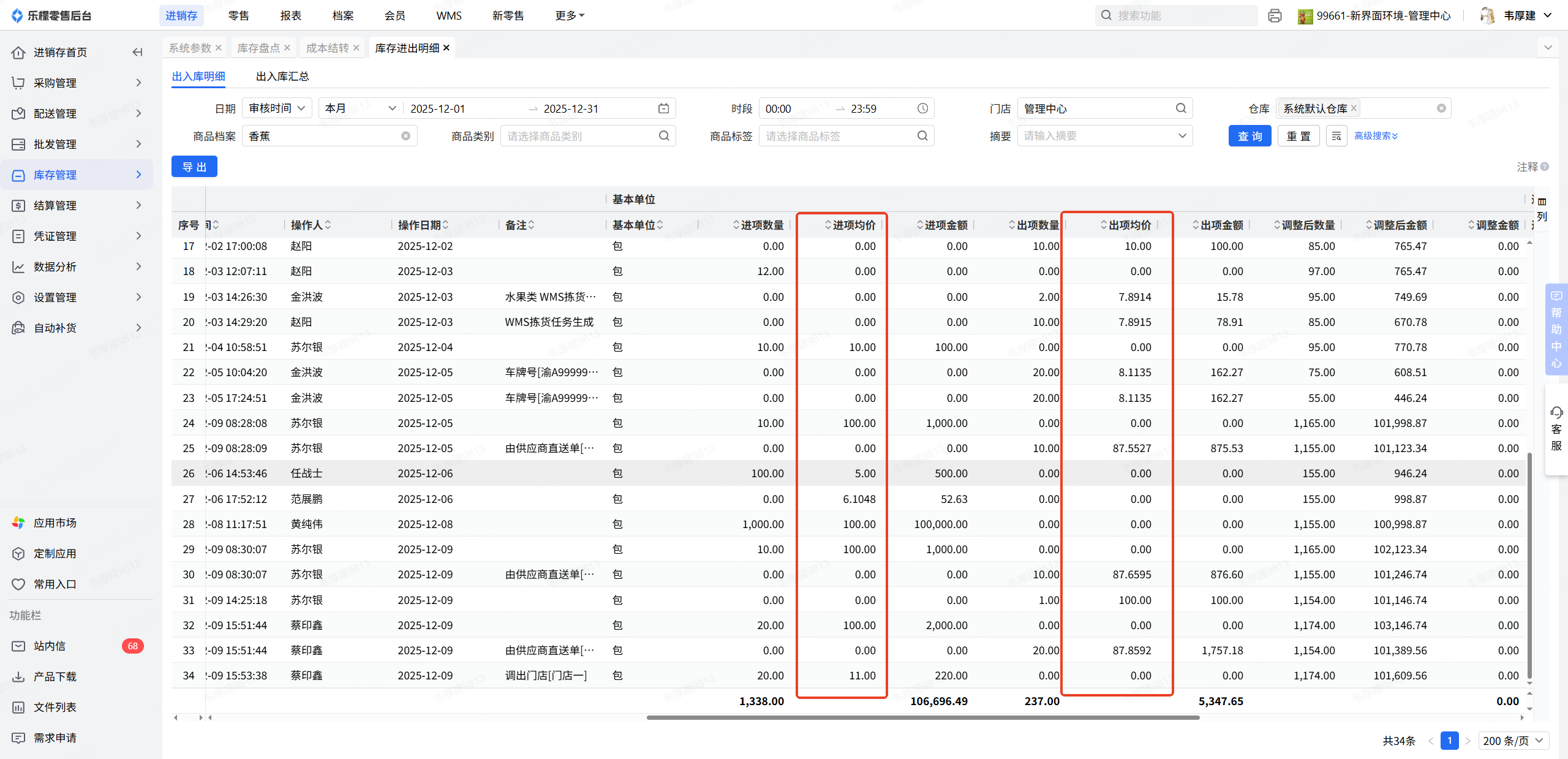 2.若未开启成本结转参数,可以到库存库存进出明细中,查看对应问题商品近期内每一条进出记录,从后往前推,查询到商品成本单价(进项均价、出项均价)发生变化的那一条记录,来推断具体原因