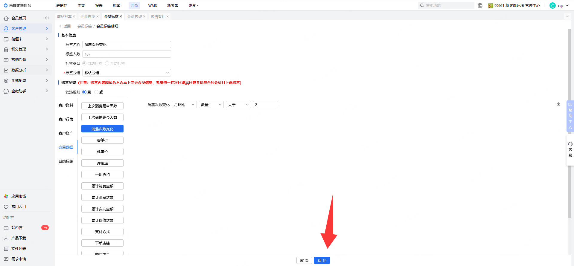 自动标签新建时会立即筛选统计出数量并自动打上标签,后续每天的凌晨再自动更新计算,并给符合的会员打上标签