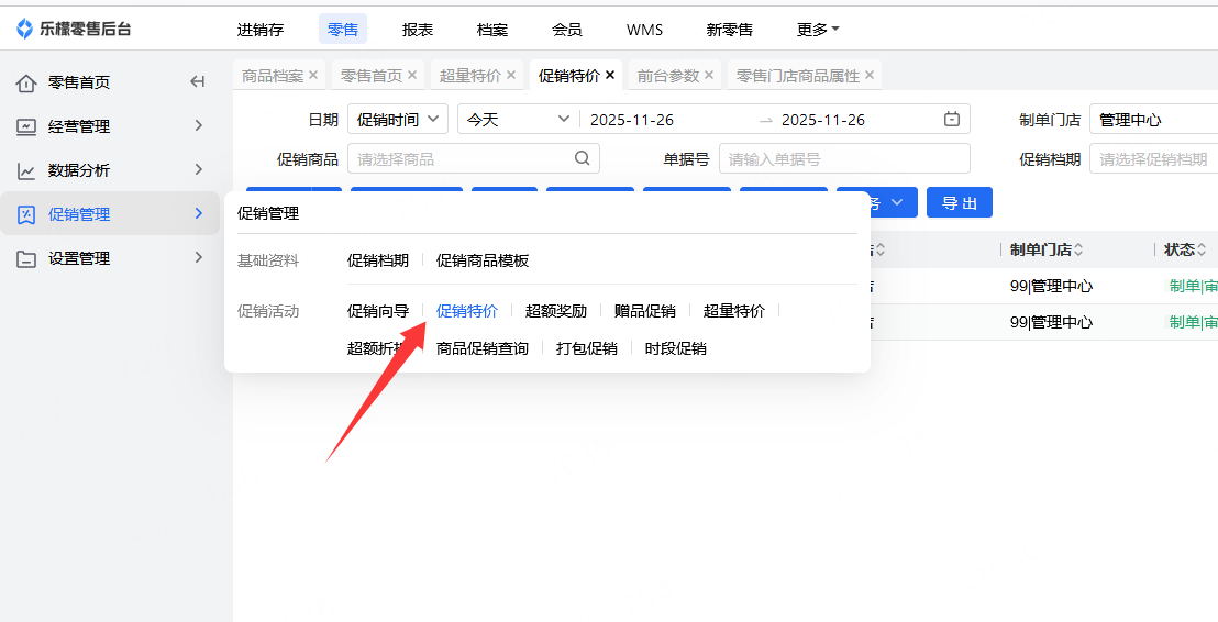 👉【操作路径】:零售-促销管理-促销活动-促销特价