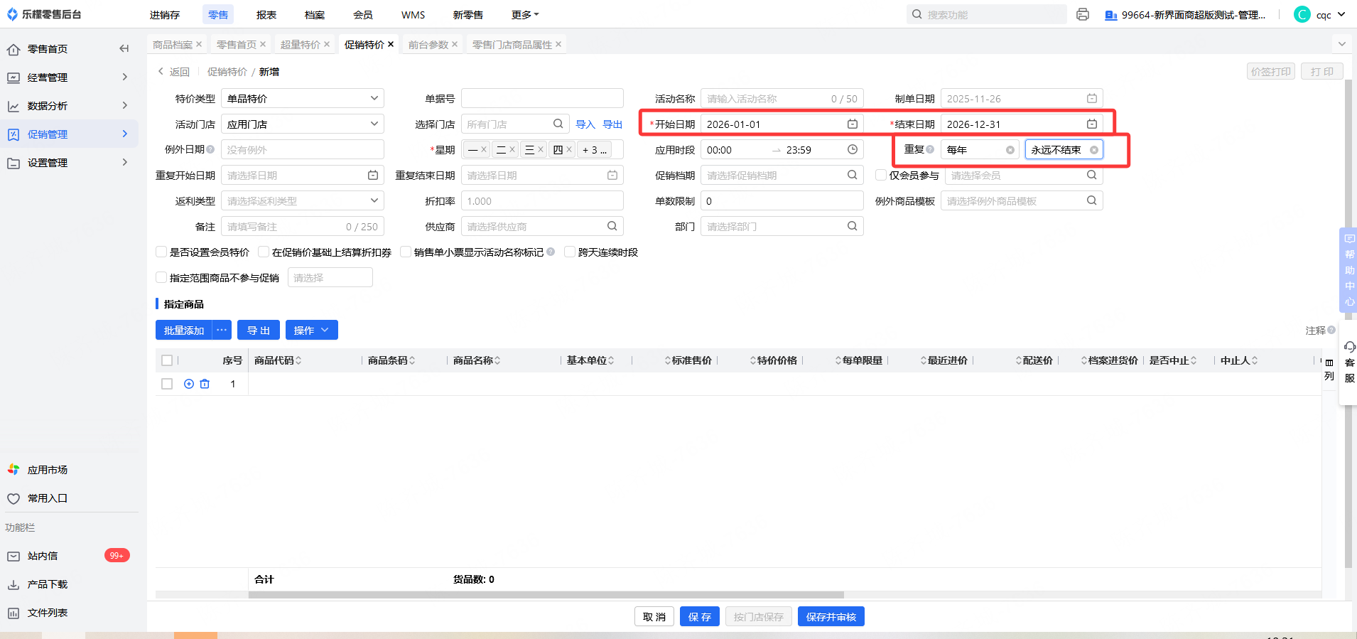 选择好开始日期和结束日期,重复地方选择每年,设置好应用门店、特价范围、折扣率等,保存审核,前台数据同步