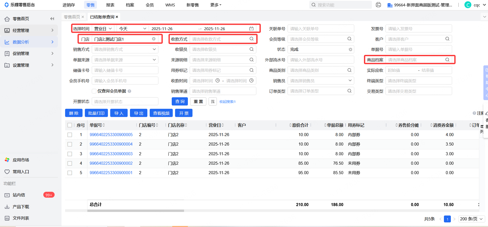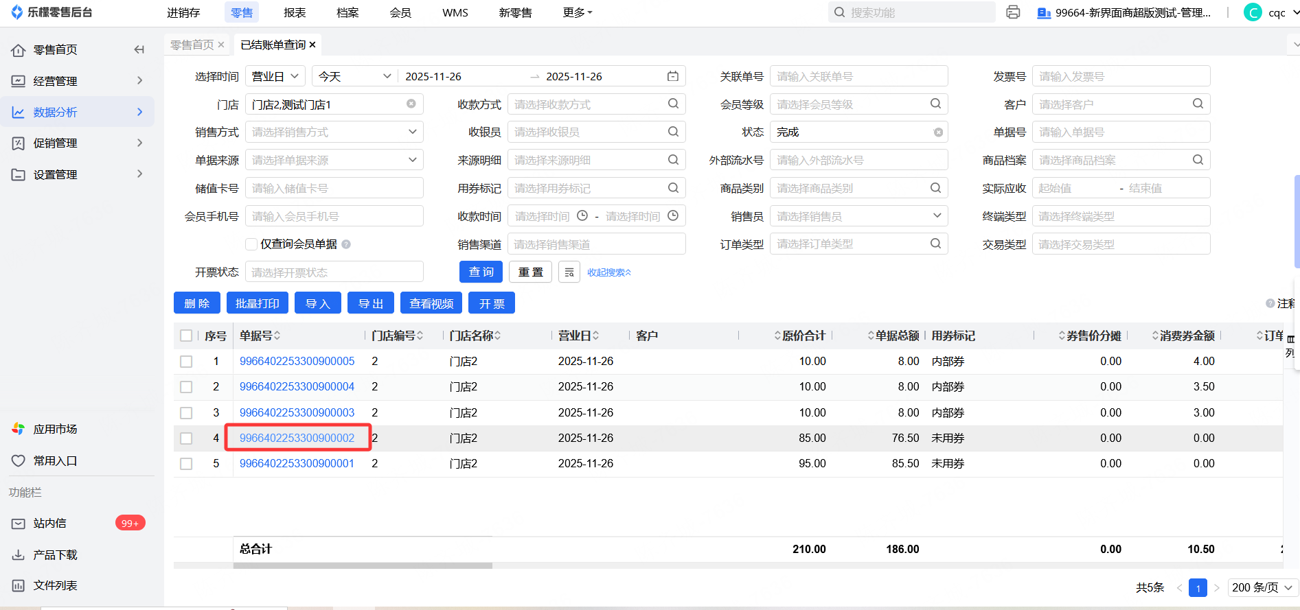 👉【操作路径】:零售-数据分析-营业统计-已结账单查询