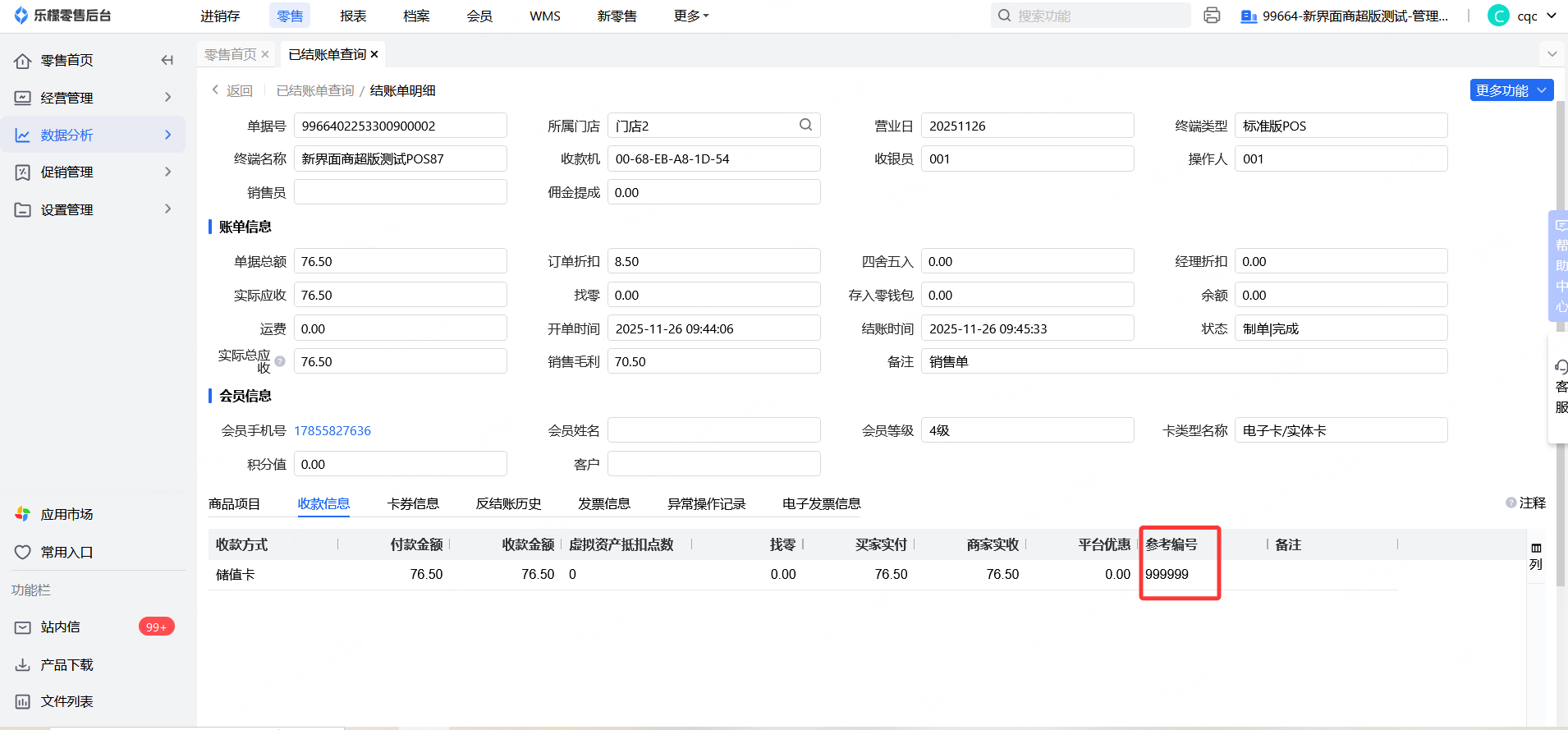 用户支付单据后,可能存在A顾客录入了会员后突然不买了,收银员将录入的商品删除(没有整单删除),导致B顾客结账时用的是A顾客的会员卡,需要查询当时单据结算时使用的会员卡卡号