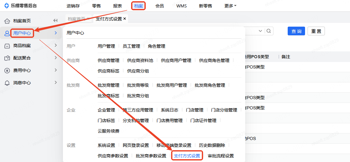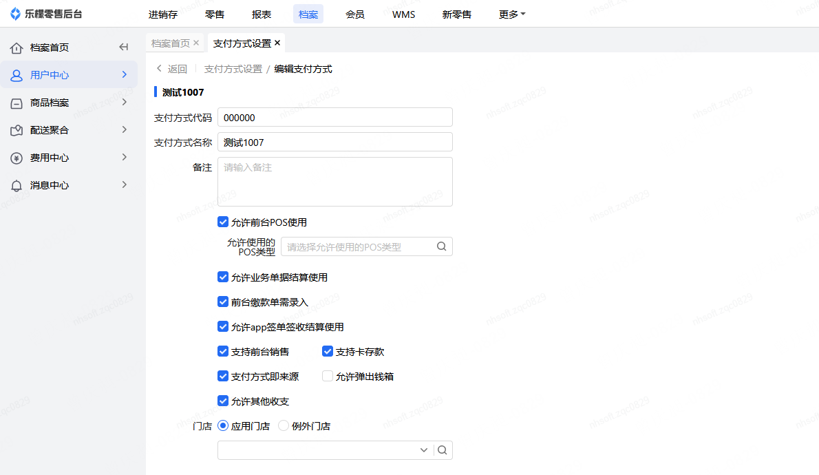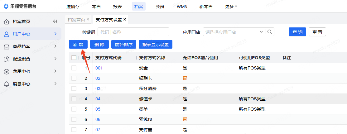 👉【操作路径】:档案-用户中心-支付方式设置-新增