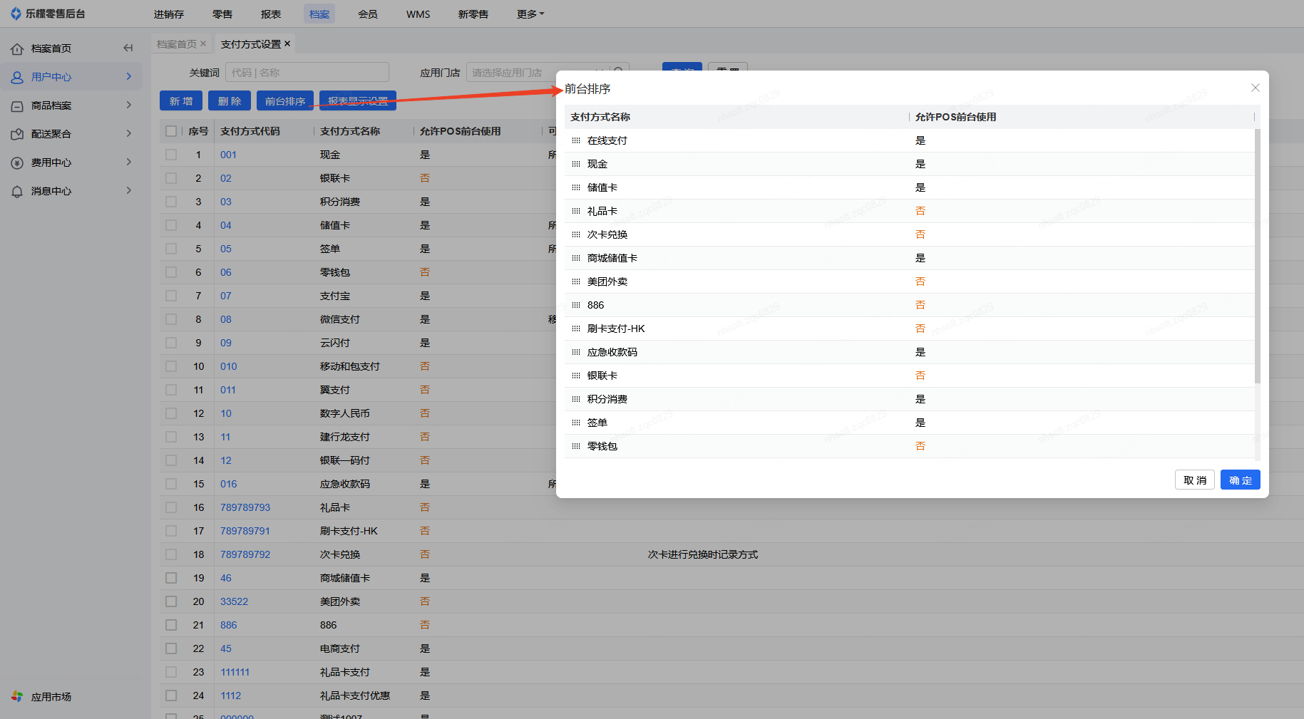 点击前台排序,可以自定义支付方式在POS上的显示顺序