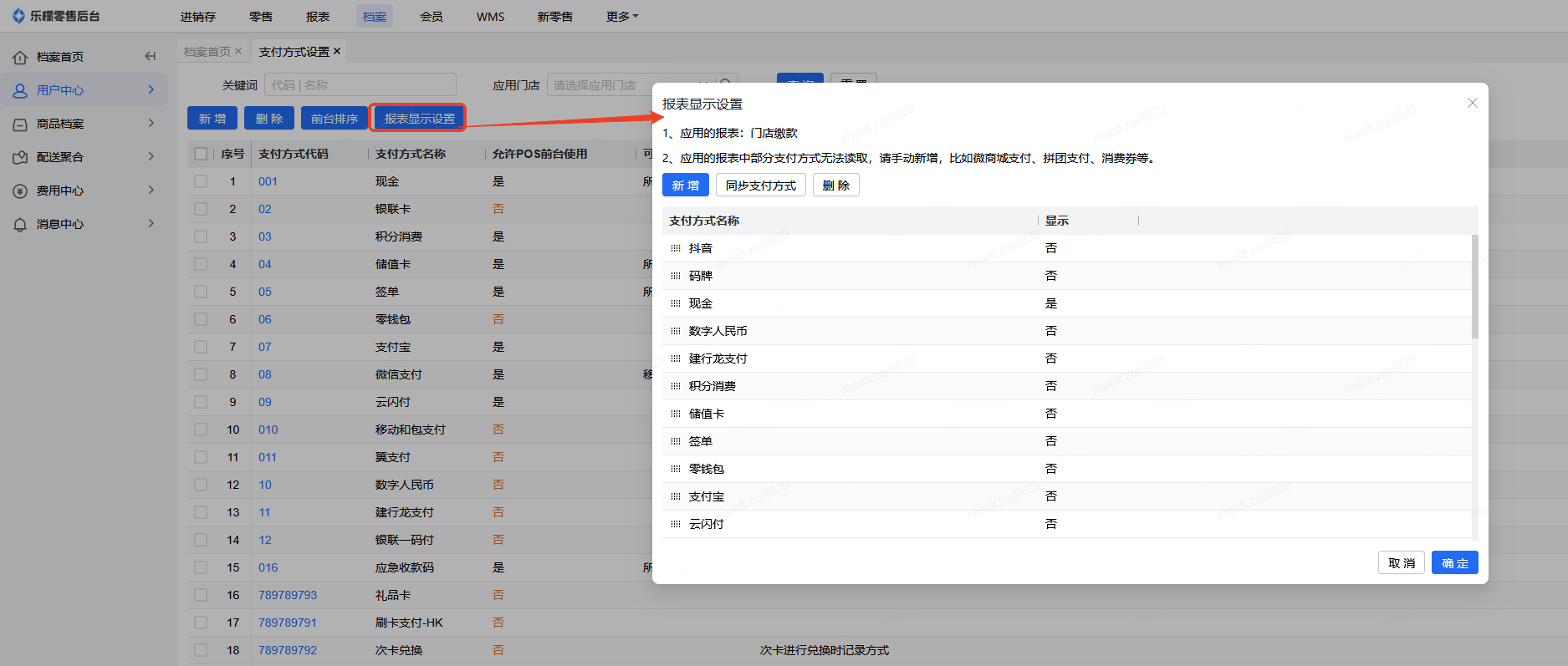 点击报表显示设置,可以自定义支付方式在门店缴款里的显示顺序