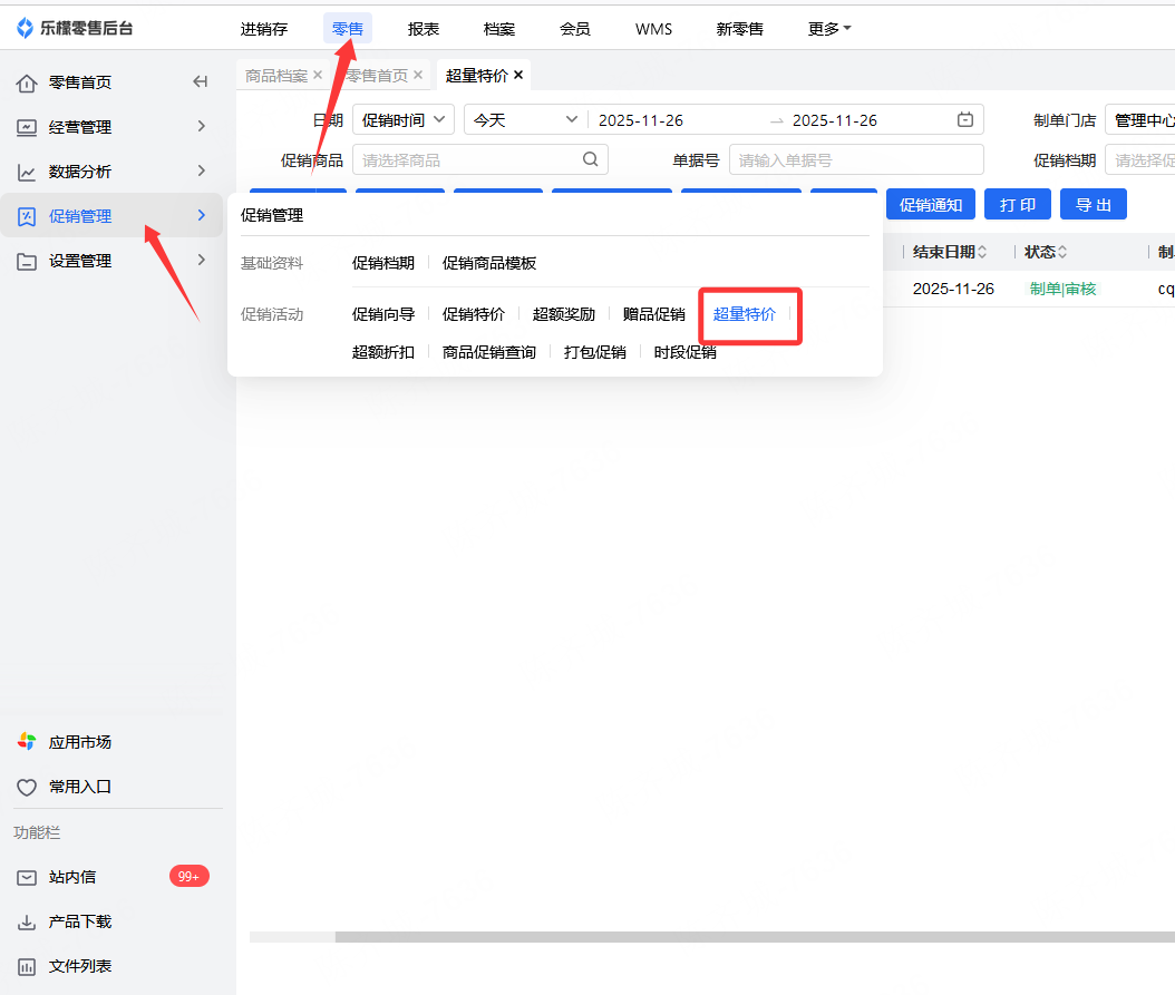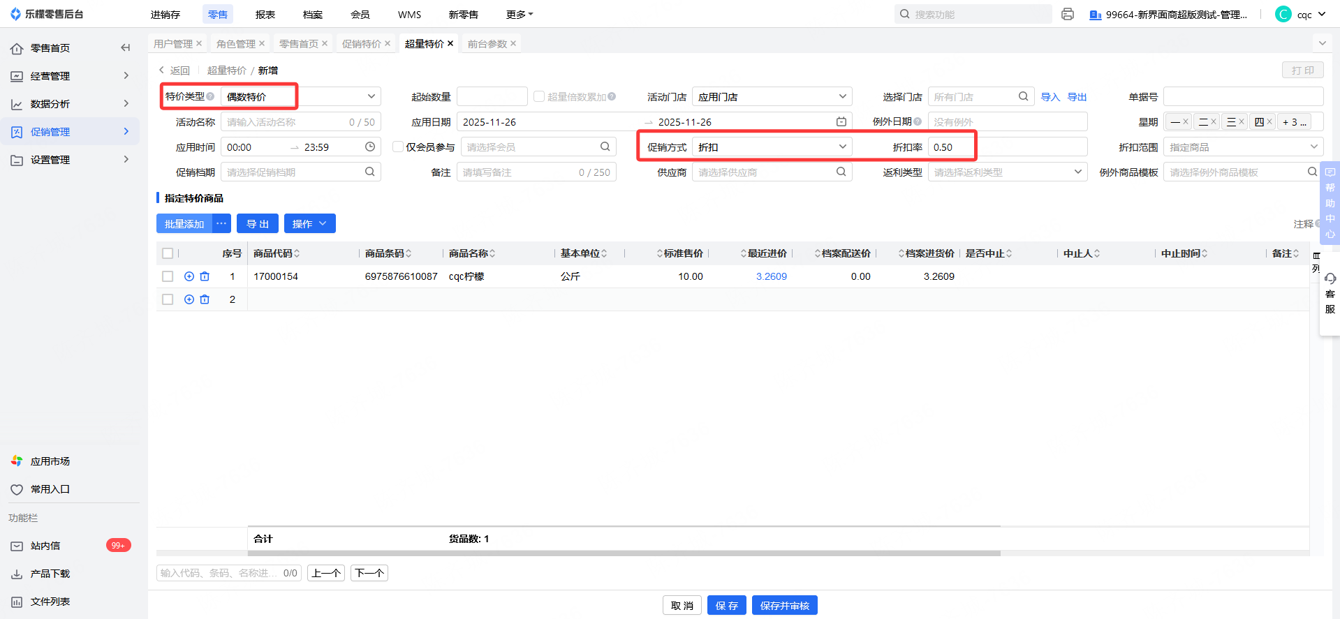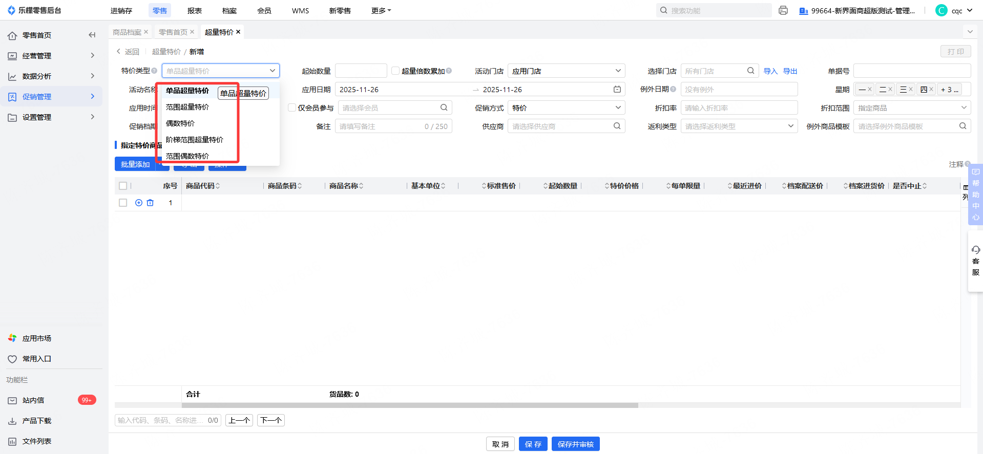 👉【操作路径】:零售-促销管理-促销活动-超量特价-新增