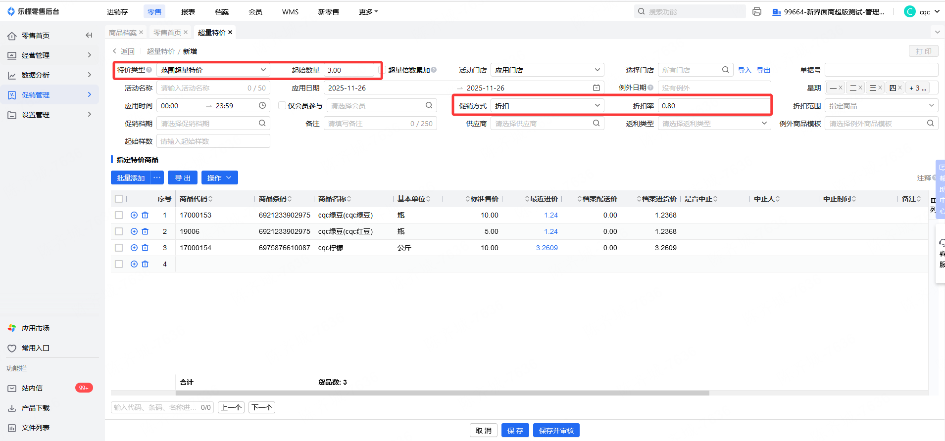 👉【操作路径】:零售-促销管理-促销活动-超量特价-新增范围超量特价