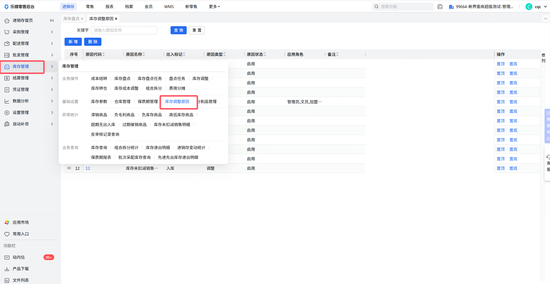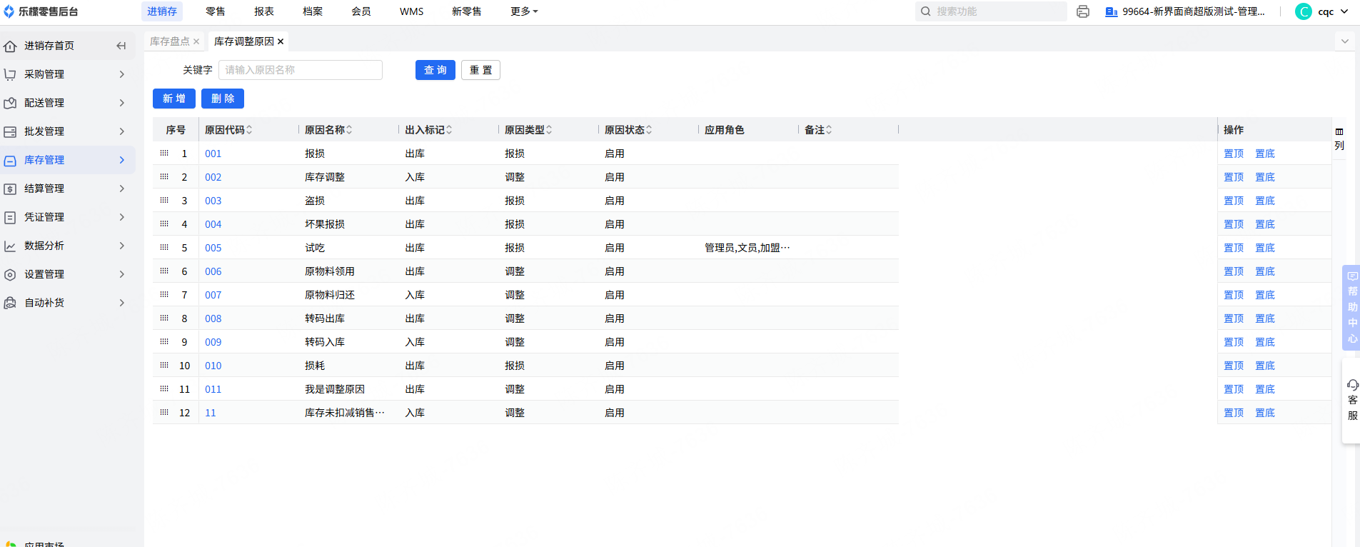 库存调整原因的出入库标记代表商品库存最终是增加还是减少,出库代表扣减库存,入库代表增加库存,应用角色可以控制用户是否能使用该原因。