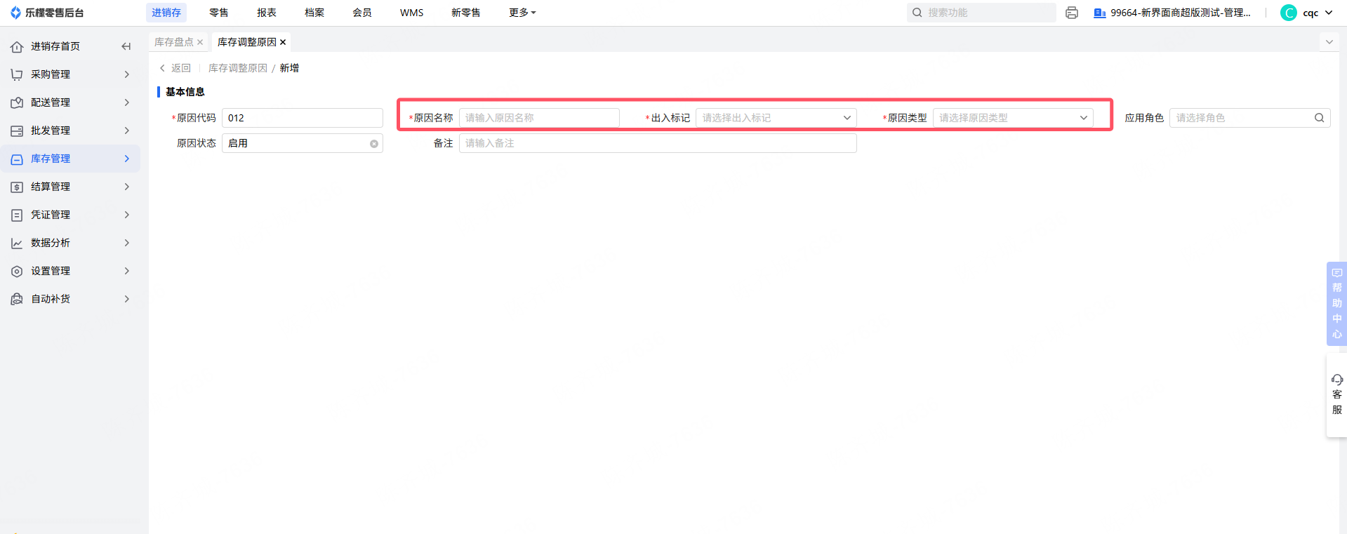1.库存调整原因管理页面点击新增,输入调整原因名称填写出入库标记和原因类型。