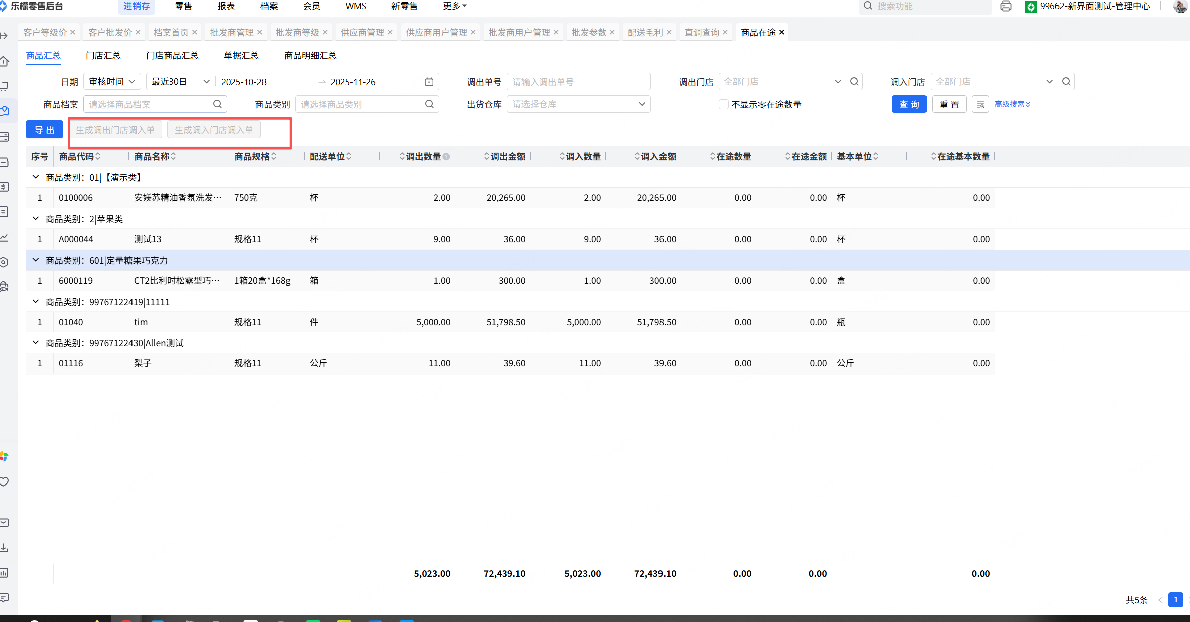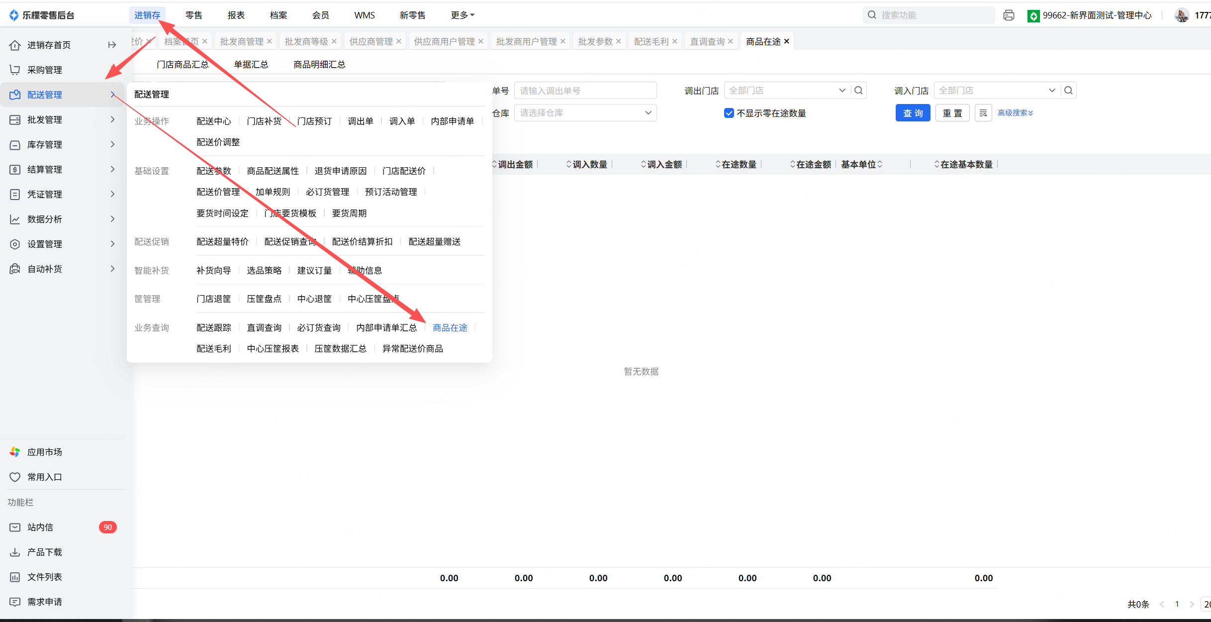 1.配送-业务查询-商品在途 选择调出门店管理中心,调入门店其他门店查询,对未收货的数据点击生成调出门店调入单或者生成调入门店调入单。