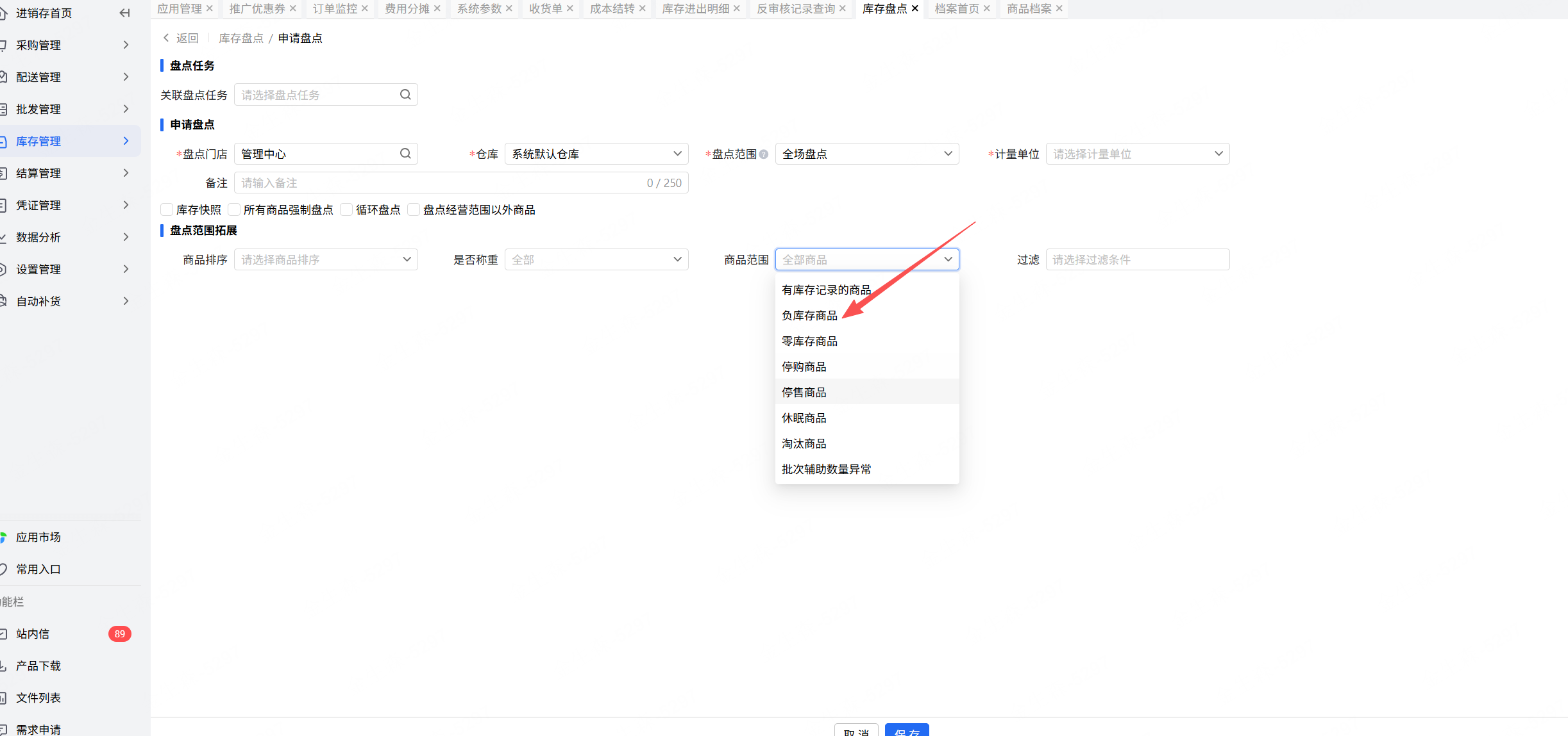 1.进销存-库存管理-库存盘点-申请盘点,选择盘点范围:全场盘点,选择单位,盘点范围扩展:商品范围选择负库存商品,保存