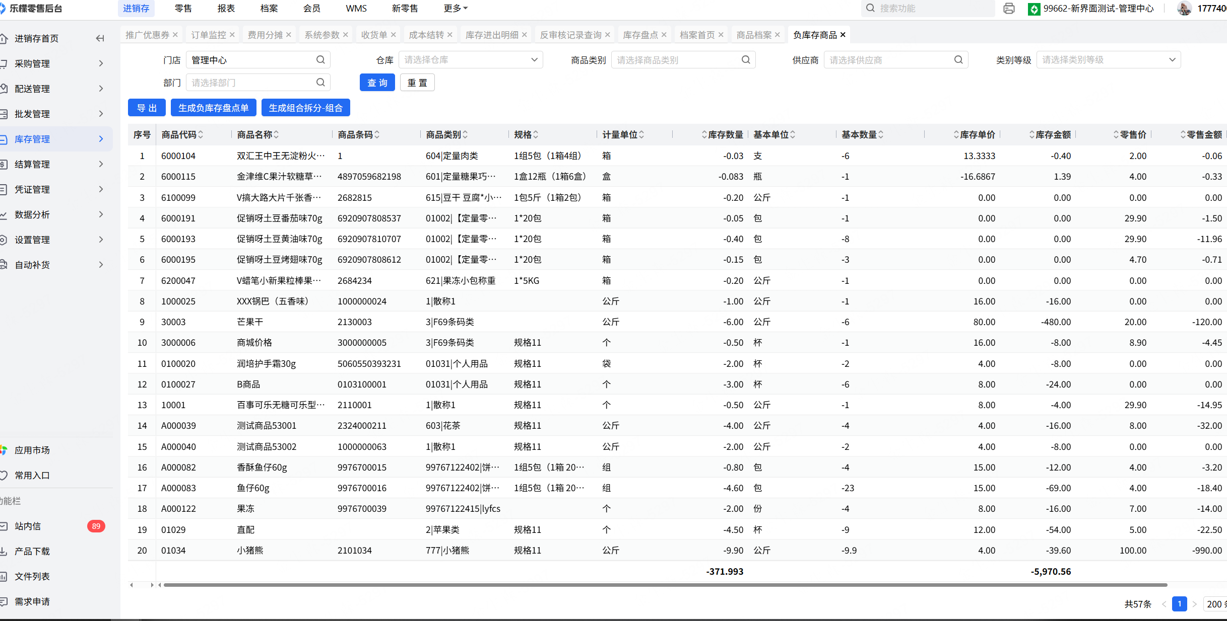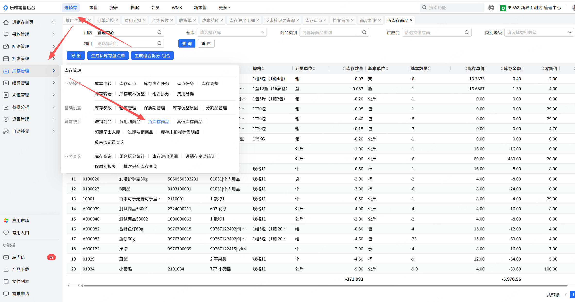 因一些原因导致系统库存为负数,想要快速筛选这些负库存商品出来盘点清零