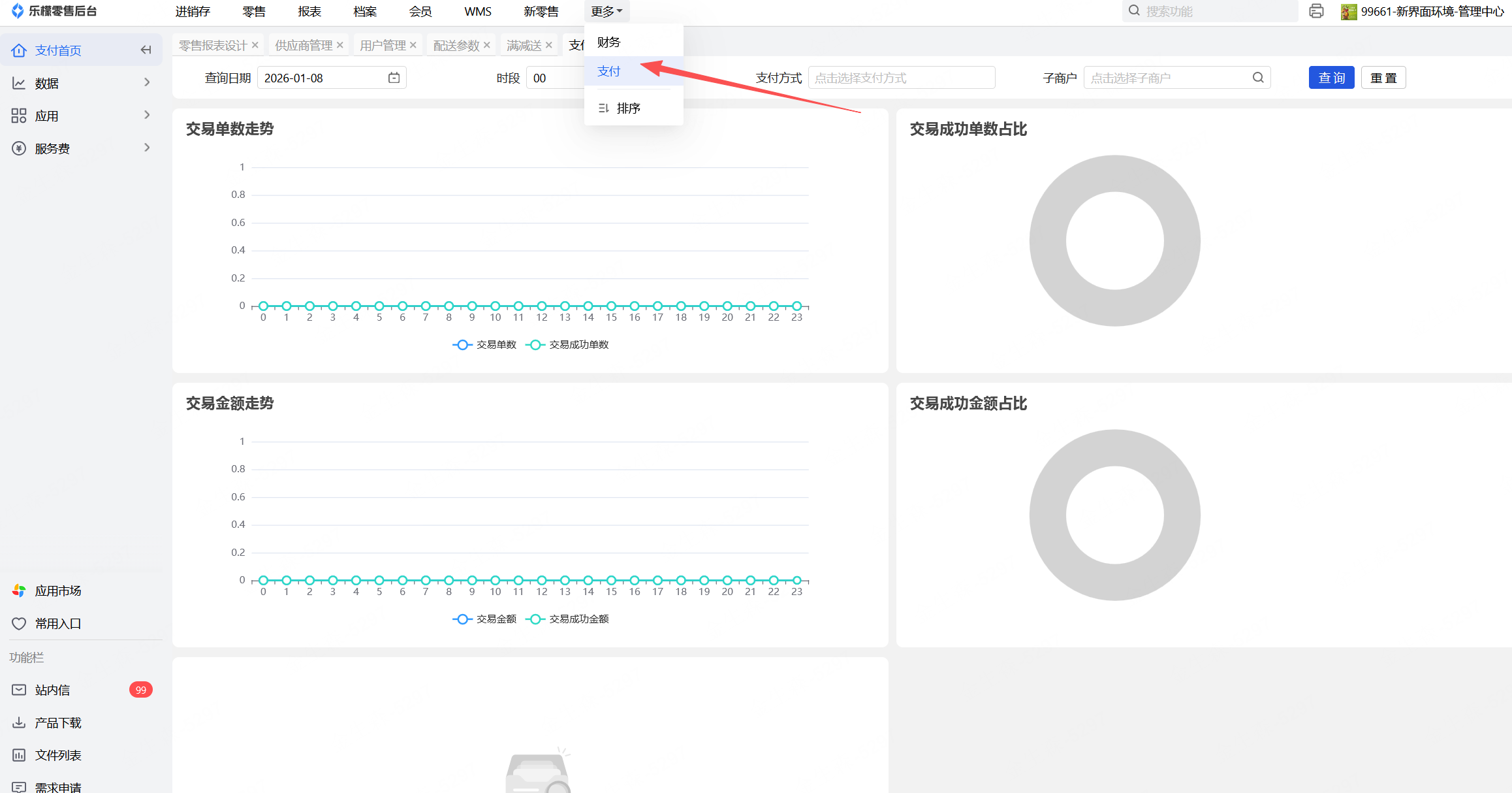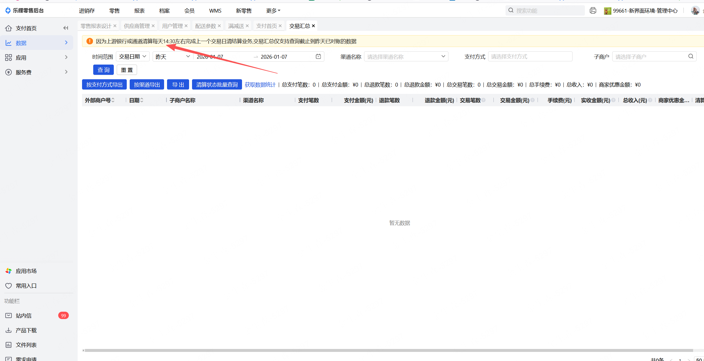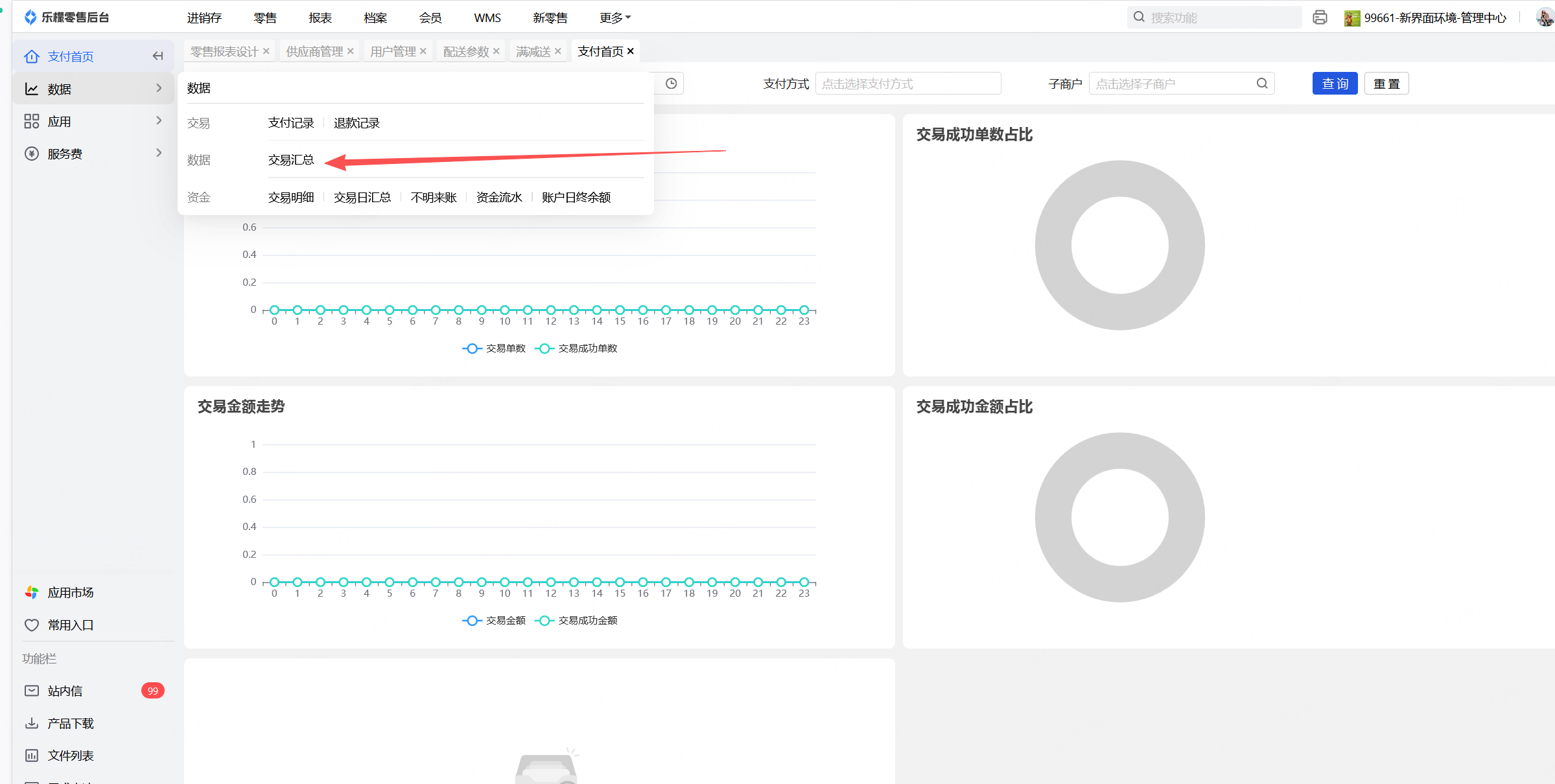 打开乐檬零售网页后台,点击支付,左上角 数据-交易汇总